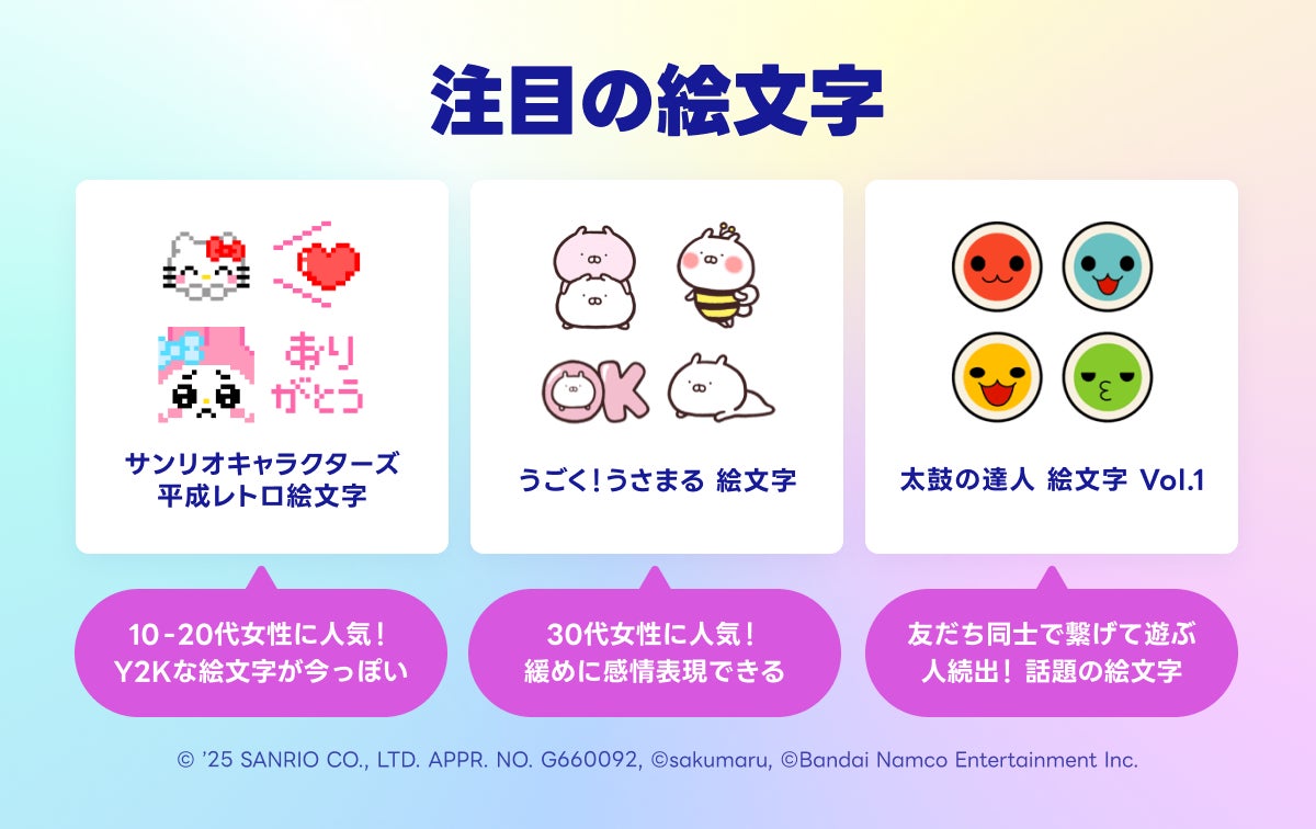 1位の「ちいかわ絵文字」は前年同期比で大幅に利用が増加し、全年代で幅広い支持を集めています。また、2024年11月に登場した「えもじの子」も堂々のランクイン。表情豊かで言葉にしにくい"曖昧な感情"が表現できるとして、リアクション機能や絵文字でも多く愛用されています。