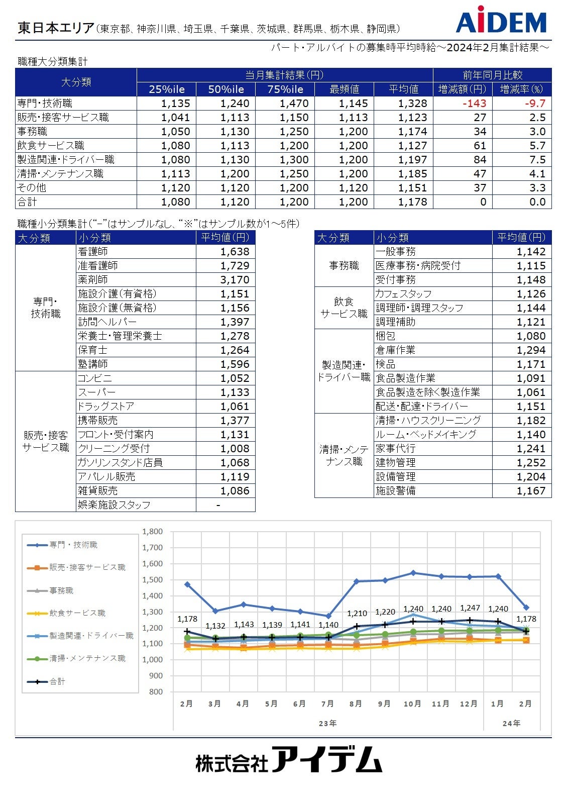 総合人材情報サービスの株式会社アイデム(本社:東京都新宿区 代表取締役社長:椛山 亮)は、求人メディア『イーアイデム』や採用ホームページ構築サービス『Jobギア採促』を利用して公表された求人情報から、2024年2月のパート・アルバイト募集時平均時給を集計いたしました。