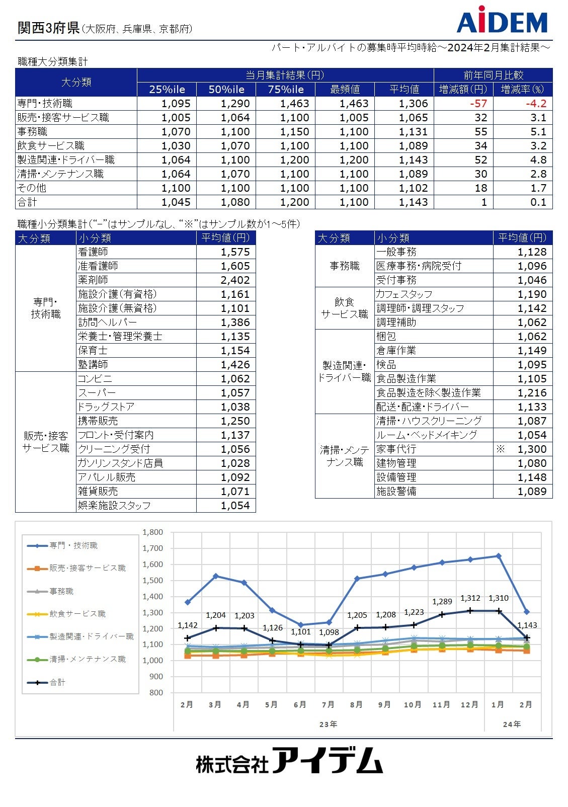 職種大分類別の平均時給は、「専門・技術職」1,306円(前年同月比57円減)、「製造関連・ドライバー職」1,143円(同52円増)、「事務職」1,131円(同55円増)、「飲食サービス職」1,089円(同34円増)、「清掃・メンテナンス職」1,089円(同30円増)、「販売・接客サービス職」1,065円(同32円増)の順で、前年同月比でプラスが5職種、マイナスが1職種となった。府県別の平均時給は、大阪府1,184円(前年同月比8円増)、京都府1,107円(同4円増)、兵庫県1,093円(同10円減)の順となり、前年同月比でプラスが2府、マイナスが1県となった。