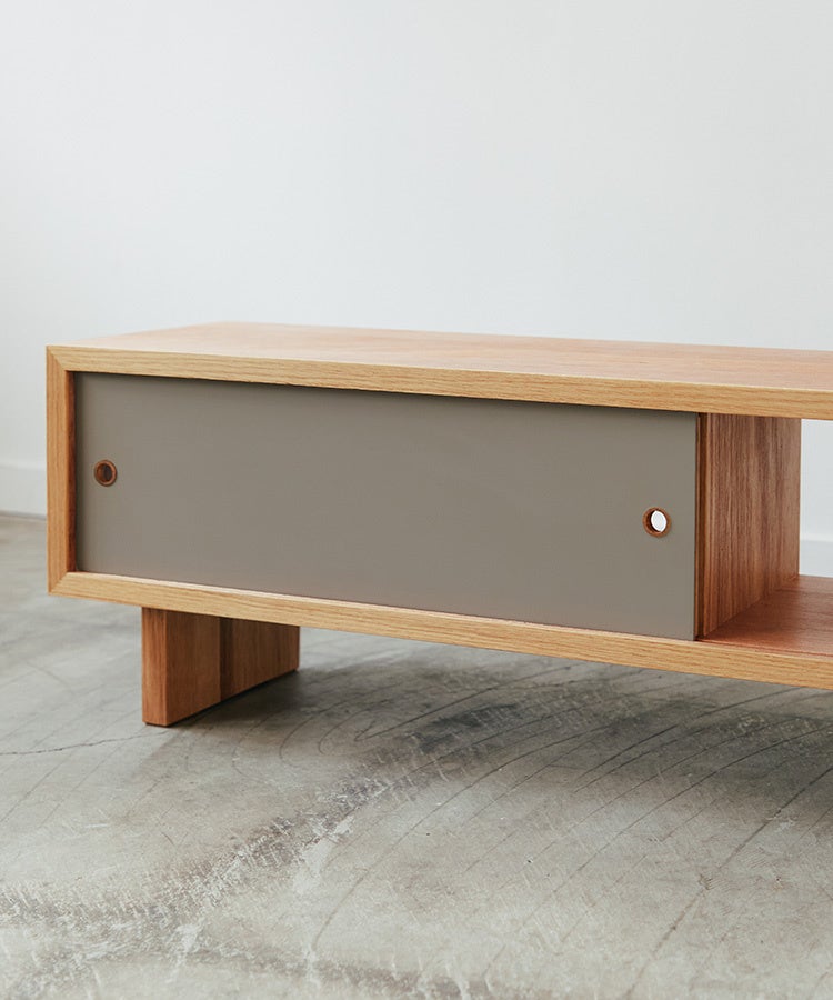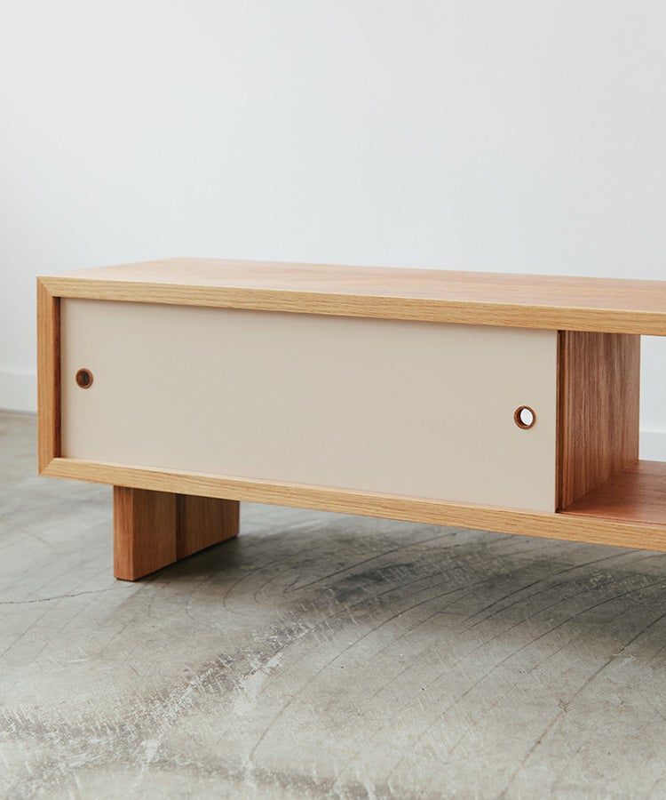 建具は左右どちらに寄せることもできる仕様です。また、建具がある面を背中にし、建具のないオープンな棚としてもご使用いただけるよう、どちらも表面にできる仕様に。
