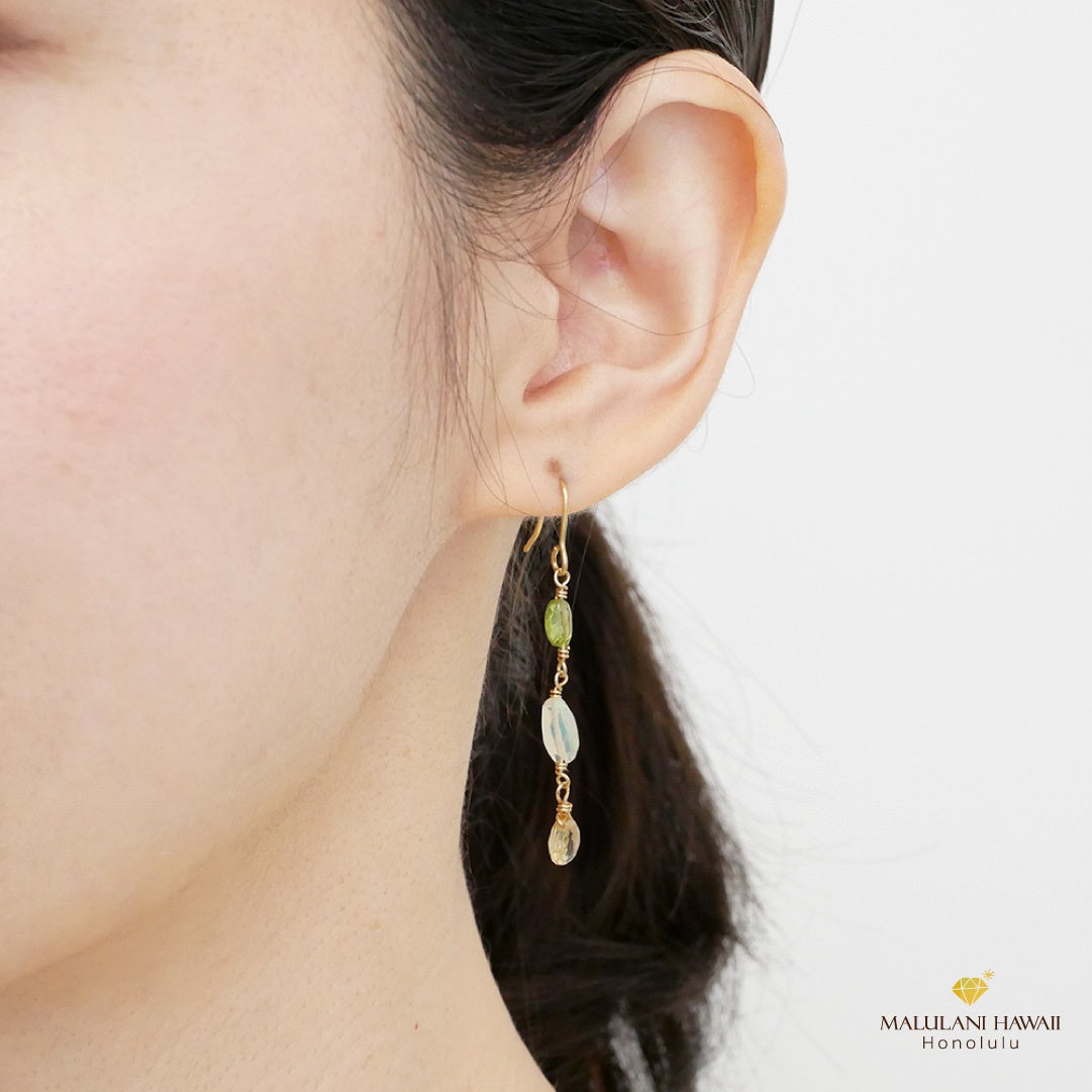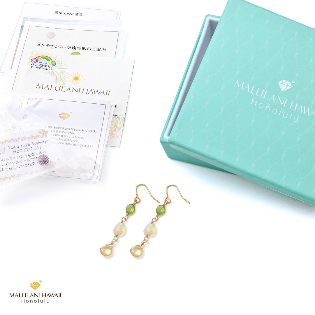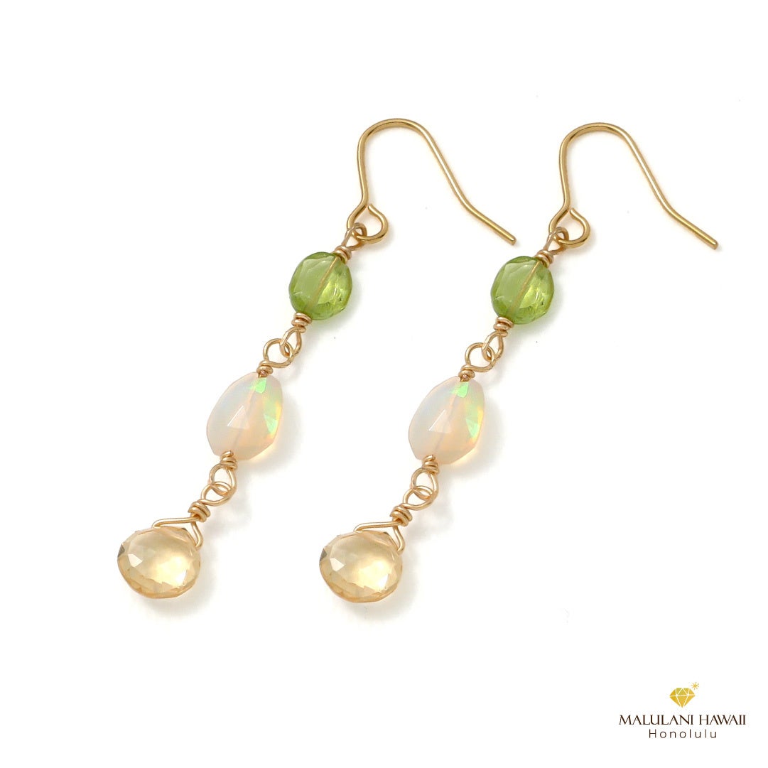 太陽を象徴するペリドットとシトリンに、虹色のプリズムを生み出すエチオピア産オパールを組み合わせた、上品に輝くピアス。