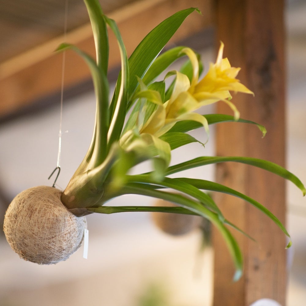枝ぶりや葉の生え方など、各々の植物の個性を見極めながら、その根を丸いかたちに包み込み、できあがったボールに応じてフックを取り付け、天井から吊るして楽しみます。もちろん、すべて手作り。