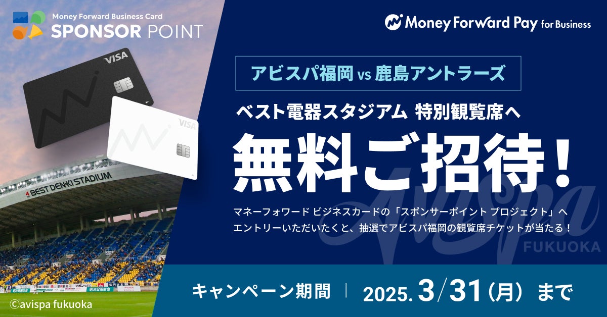 株式会社マネ―フォワードは、シャレンパートナーであるアビスパ福岡の5月6日(火)のホームゲームにて冠試合『マネーフォワードDAY』を開催します。開催にあたって、2025年3月5日(水)より、「5月6日(火)鹿島戦|特別観覧席へ無料ご招待!『マネーフォワード ビジネスカード』キャンペーン」を開始します。