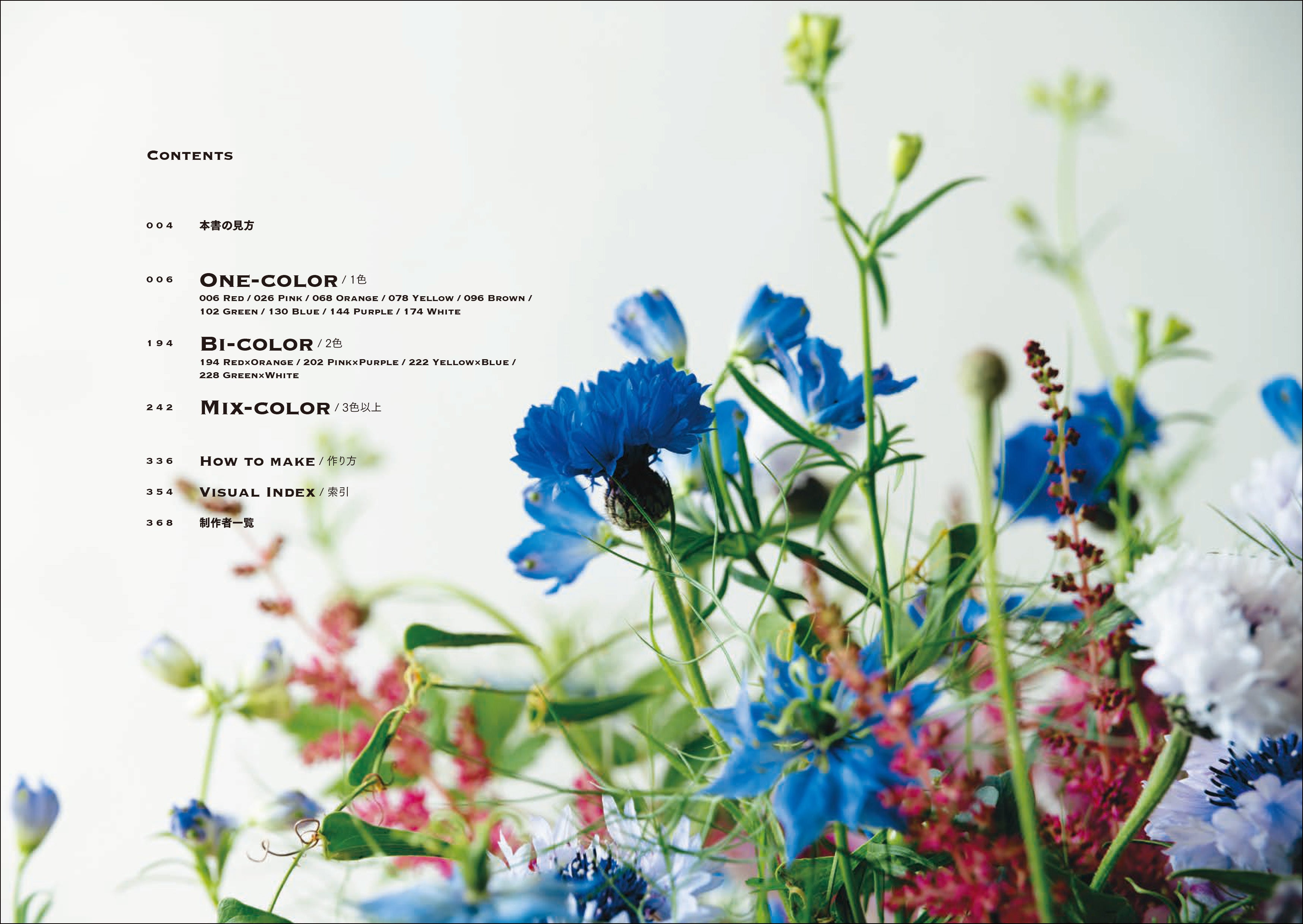 全9色のワンカラー(レッド、ピンク、オレンジ、イエロー、ブラウン、グリーン、ブルー、パープル、ホワイト)と全4パターンのバイカラー(レッド×オレンジ、ピンク×パープル、イエロー×ブルー、グリーン×ホワイト)、グラデーションが美しいミックスカラーの花束など、配色別の構成でさまざまなアイデアを紹介します。