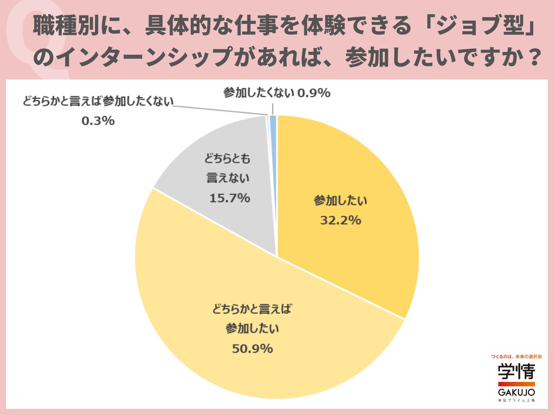 職種別に具体的な仕事を体験できる「ジョブ型」のインターンシップがあれば参加したいか聞いたところ、「参加したい」が32.2%、「どちらかと言えば参加したい」50.9%を合わせると、計83.1%を占めました。「ジョブ型に対する理解が深まり、スキルも高められると思う」「どんな雰囲気か感じてみたい」「社会経験を積むことができる」「専門性が高い職場の雰囲気や実務内容を知りたい」といった声が上がりました。