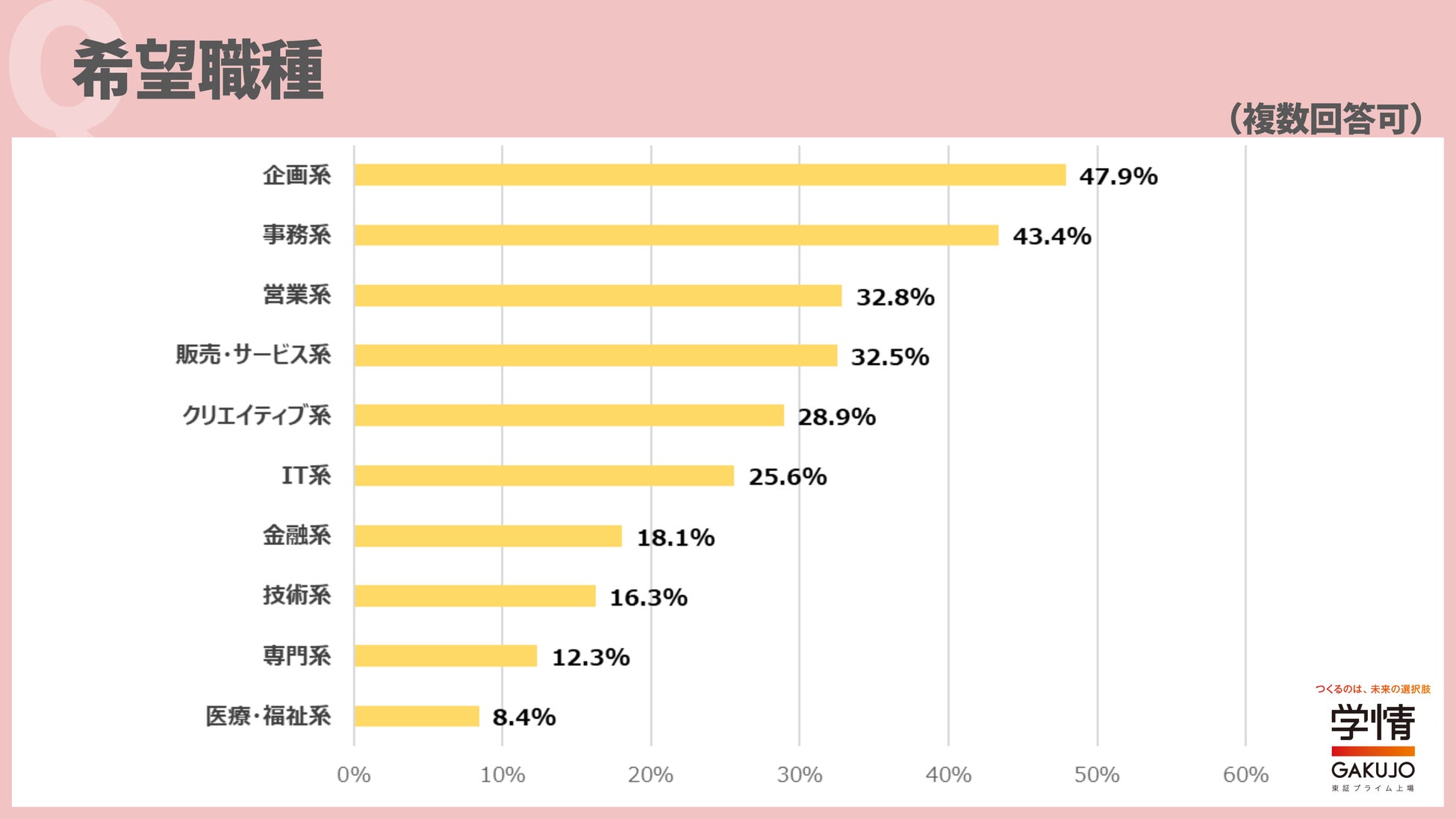 現時点での希望職種を選ぶ設問(複数回答可)では、「企画系」がトップで47.9%。続いて「事務系」43.4%、「営業系」32.8%、「販売・サービス系」32.5%、「クリエイティブ系」28.9%、「IT系」25.6%の順でした。
