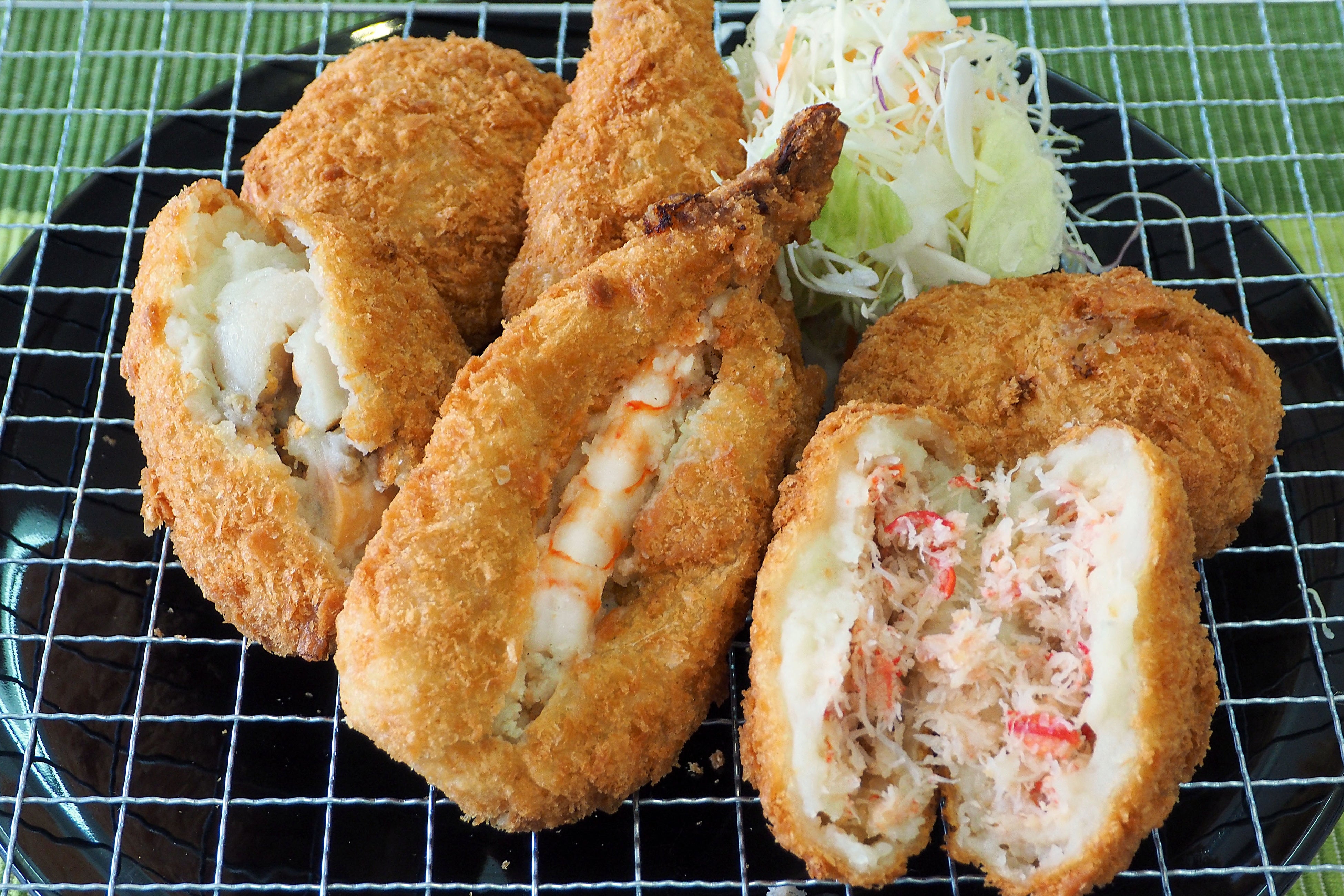 まるごとかにコロッケ、まるごとえびコロッケ、まるごとほたてコロッケ(各1個)各432円