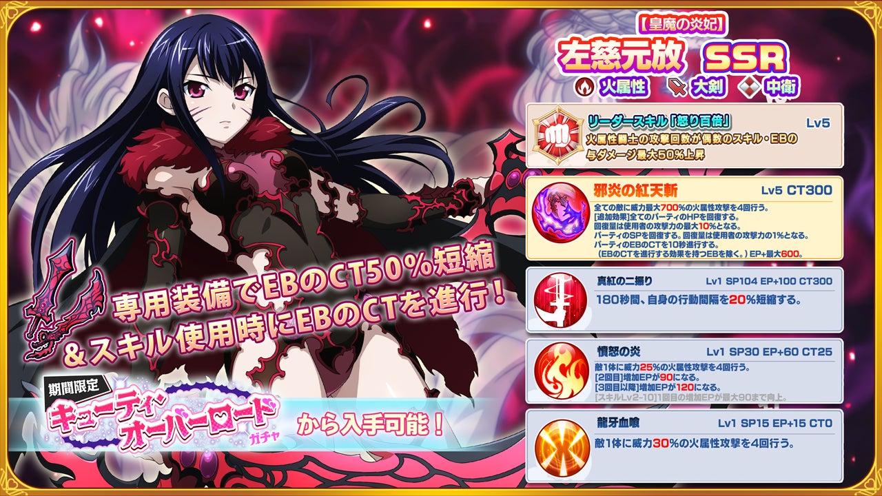 同ガチャでは、「【皇魔の炎妃】左慈元放」の排出率が他の同レアリティの闘士よりも高くなっております!