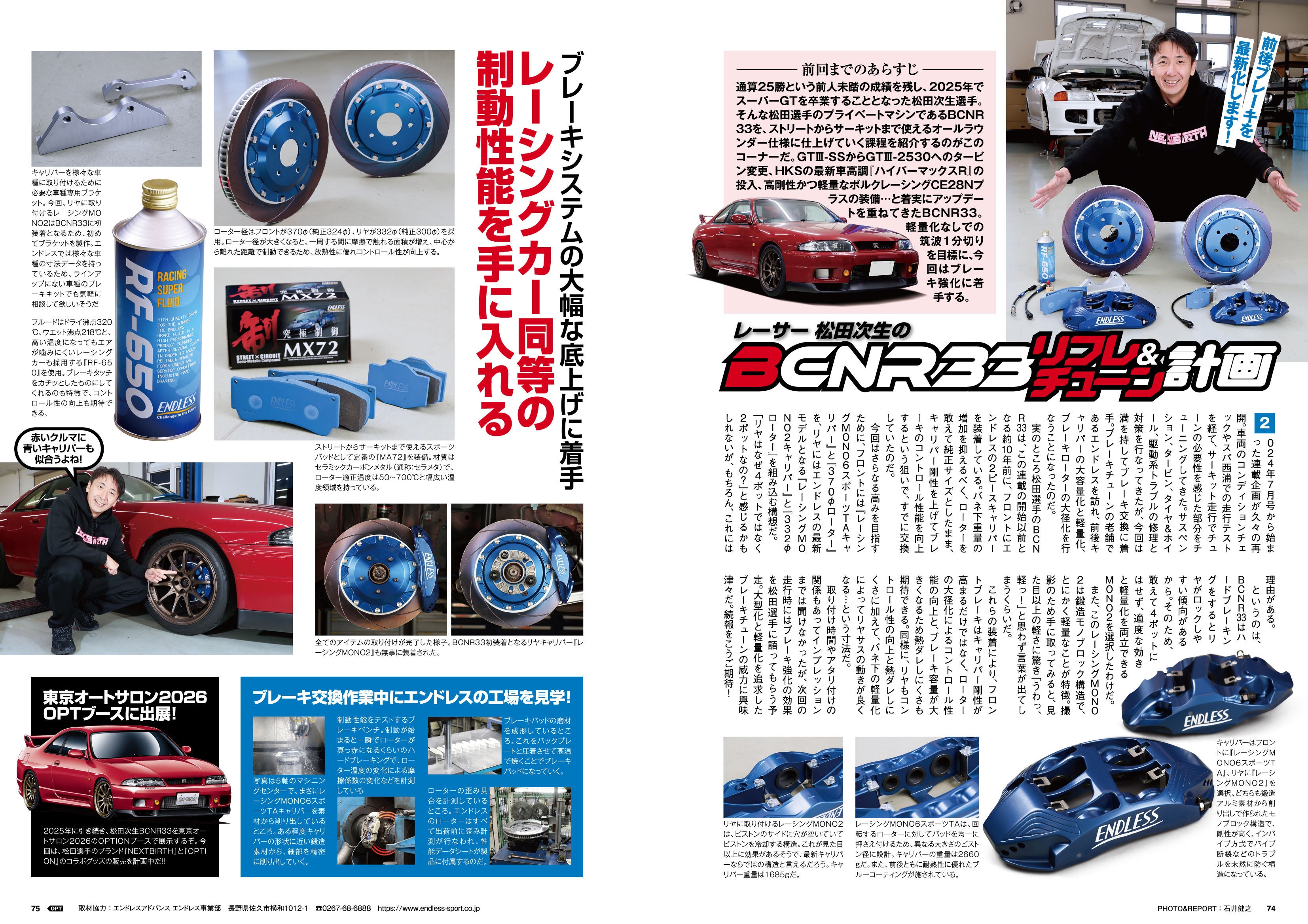 2025年でスーパーGTを卒業することとなった松田次生選手のプライベートマシンであるBCNR33を、ストリートからサーキットまで使えるオールラウンダー仕様に仕上げていく課程を紹介するコーナー。軽量化なしでの筑波1分切りを目標に、今回はブレーキ強化に着手する。