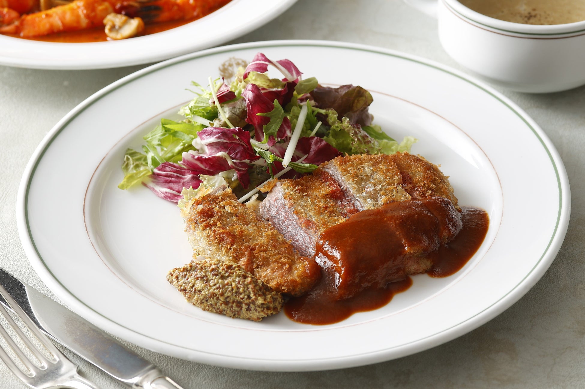 牛フィレ肉を丁寧に焼き上げ、ホテル伝統のデミグラスをベースにリーペリンソースを隠し味に加えたソースをかけてお召し上がりいただく、食べ応え抜群のおすすめメニューです。濃厚なソースとアクセントの粒マスタードがジューシーなカツの美味しさをより一層引き立てます。