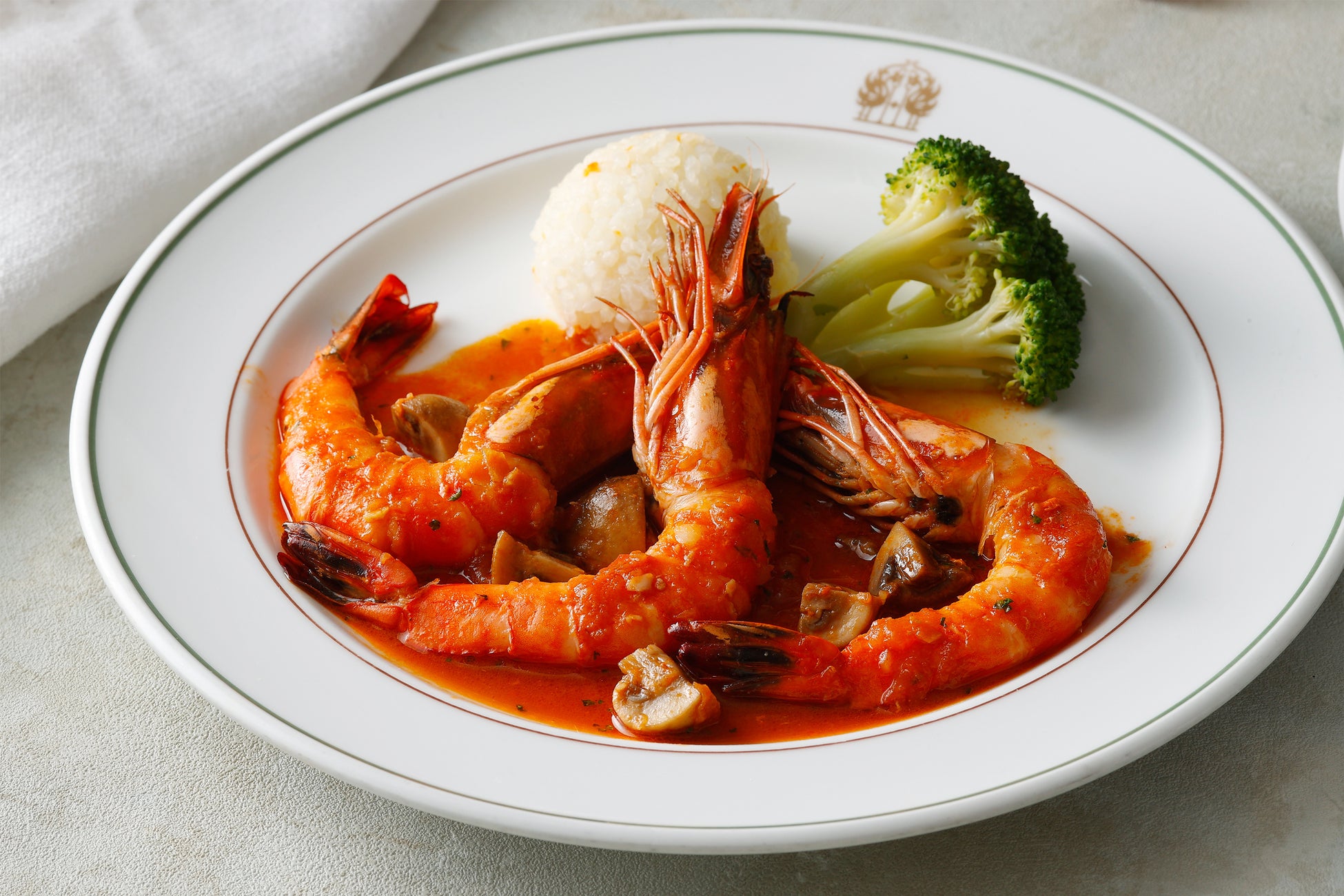 海老を丸ごとブランデーでフランベすることで、海老の出汁までしっかりとご堪能いただけるよう仕上げた一品。ソースは、旨味たっぷりのアメリカンソース、白ワイン、トマトのコンカッセ(角切り)、最後にバターを加えた、まろやかなコク深い味わいです。