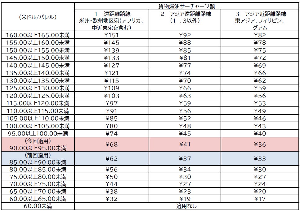 基準となる2025年11月のジェット燃料の平均価格が1バレルあたり93.11米ドルであったことから、燃油指標価格を「90.00以上95.00未満」とし、サーチャージ額は1kgあたり68円(米州・欧州など遠距離路線)、41円(アジア遠距離路線)、36円(アジア近距離路線)となります。