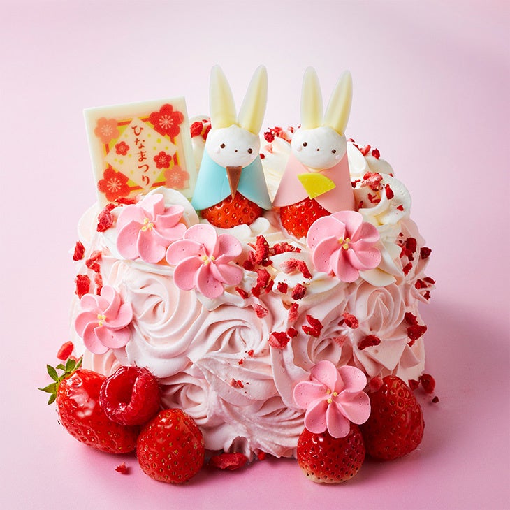 苺で作ったうさぎのお内裏さまとおひなさまが彩りを添える、華やかなデコレーションケーキ。