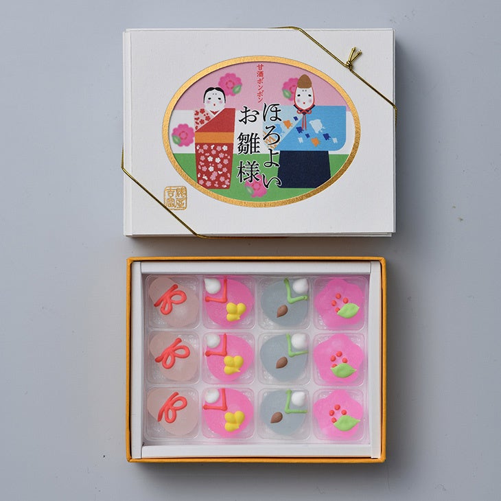 お内裏さまやお雛さまの愛らしい姿や桃の花など、雛の節句にちなみおつくりした甘酒ボンボンです。