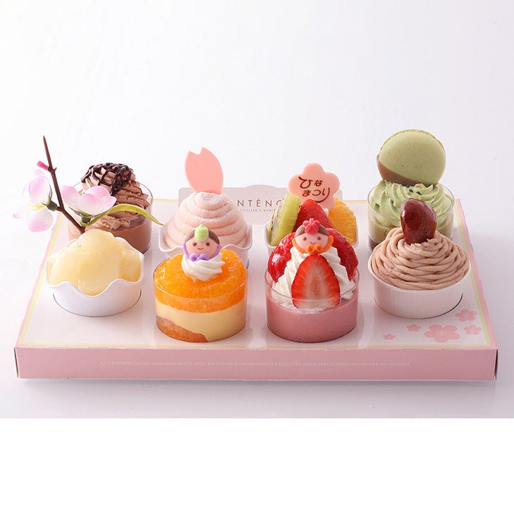 苺のムース、モンブラン、ショコラ、レアチーズ、桃のムース、小倉抹茶、フルーツババロワ、マンゴーババロワと多彩な味わいが楽しめるセット。