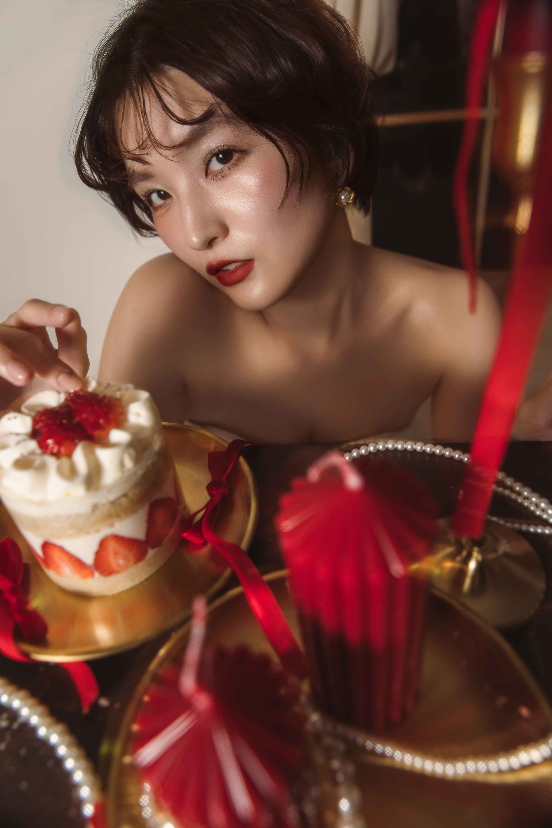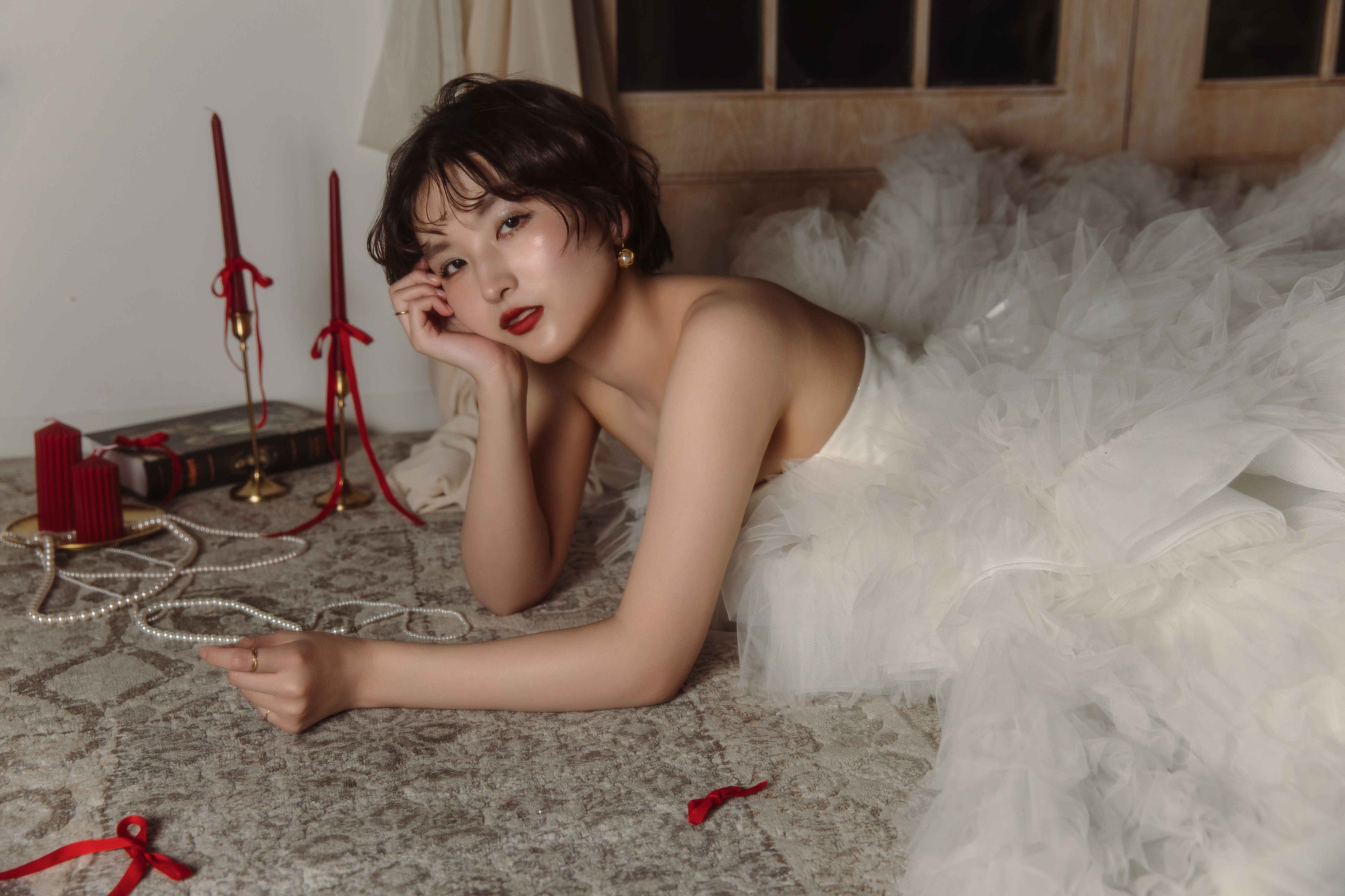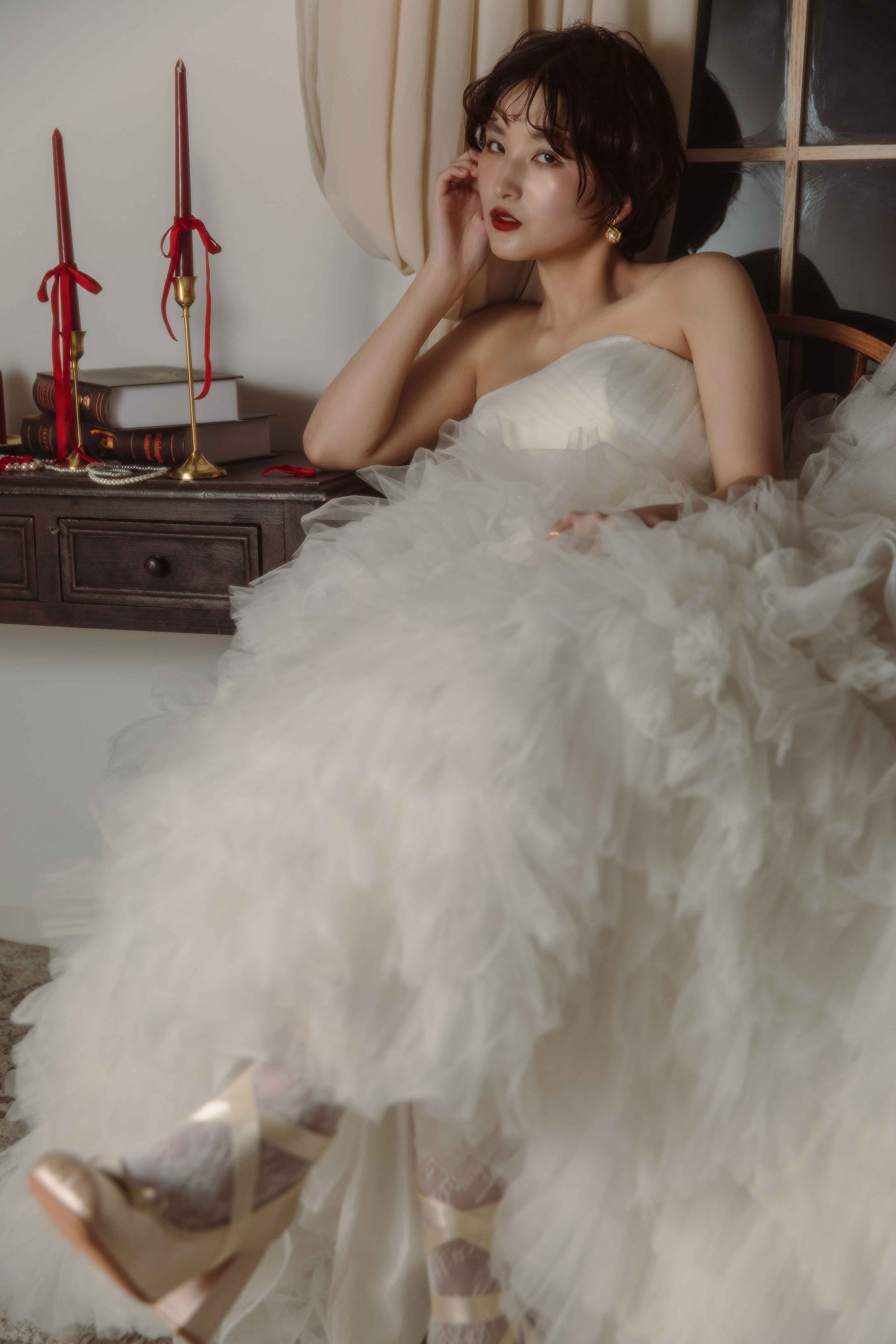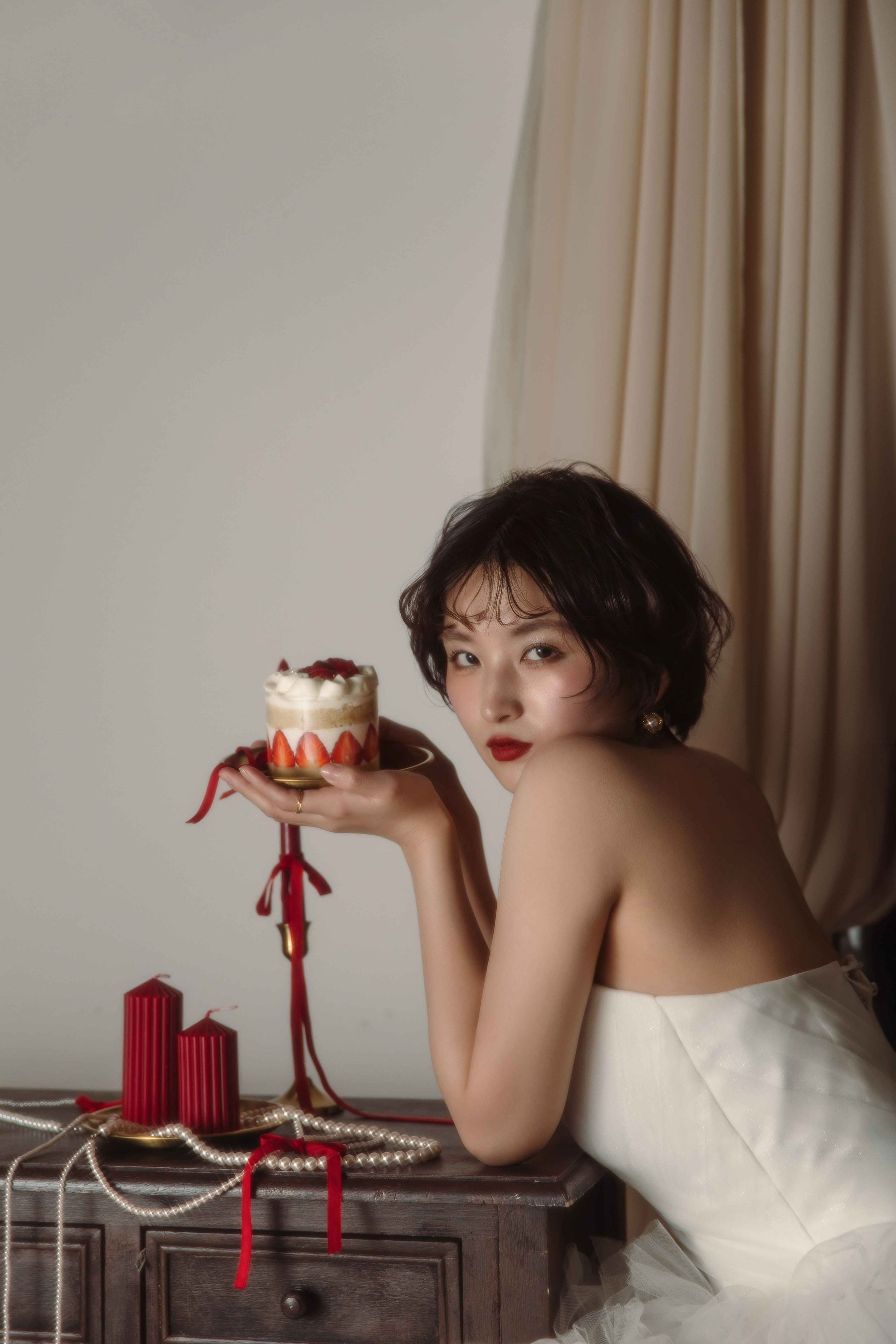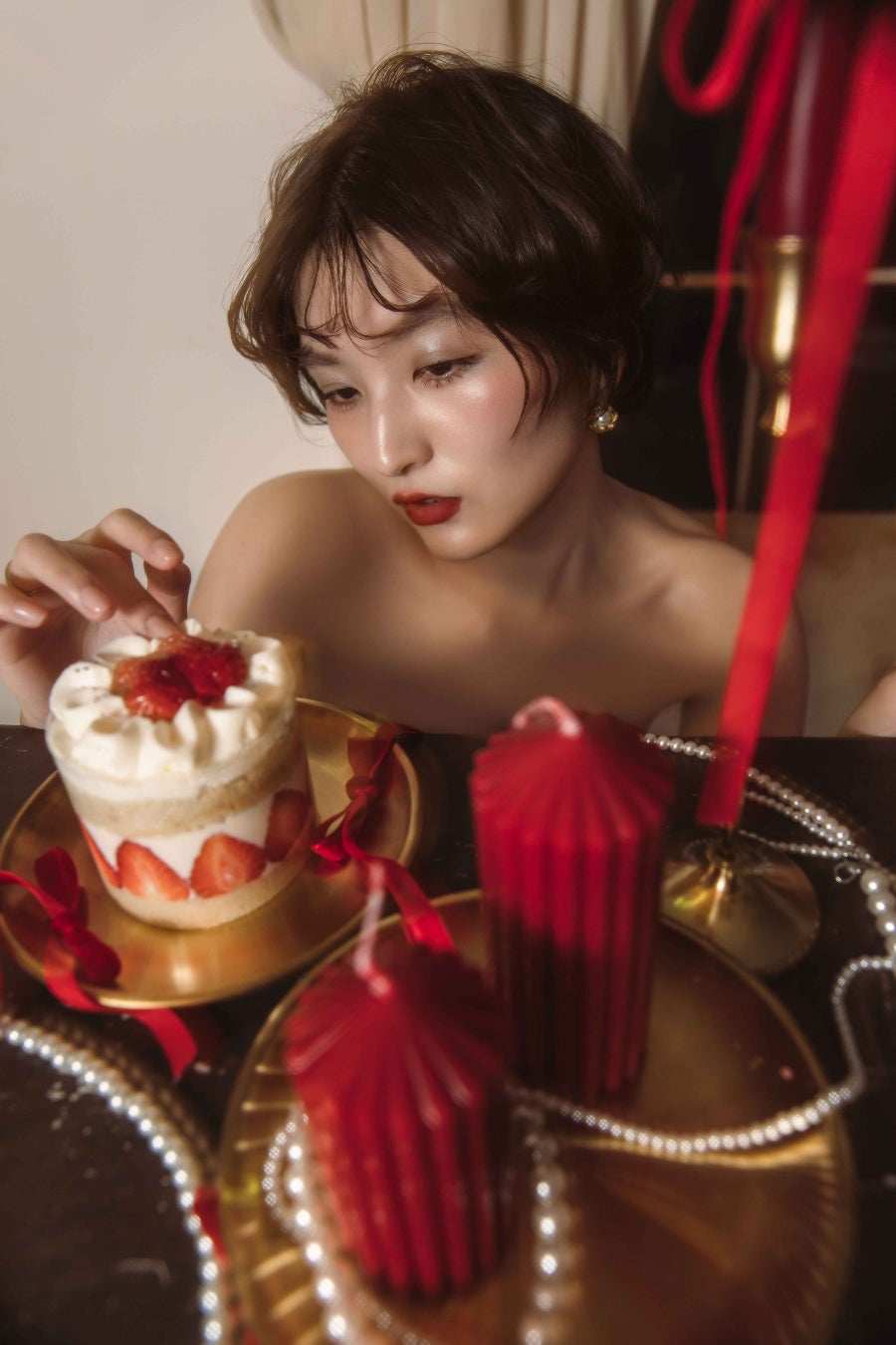 ヘアメイクでは、ベルベットの質感を肌に、深紅を唇にのせることで、二十歳が持つ芯の強さを引き出します。空気を含んだアンニュイなウェーブヘアと、贅沢に重ねたパールのレイヤードが、物語を完成させます。