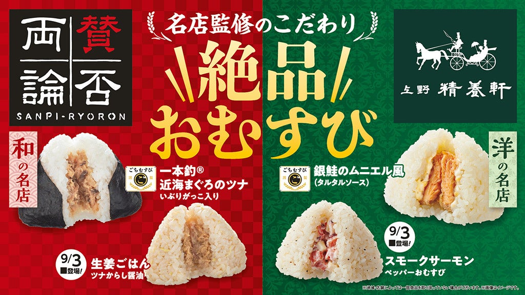 第一弾として、お米・具材にこだわった贅沢おむすび「ごちむすび」シリーズとして、『賛否両論』監修「ごちむすび 一本釣®近海まぐろのツナ いぶりがっこ入り」、『上野精養軒』監修「ごちむすび 銀鮭のムニエル風(タルタルソース)」を発売します。名店監修のこだわり抜いた絶品おむすびをぜひお楽しみください。