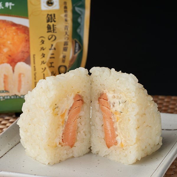 「ごちむすび 銀鮭のムニエル風(タルタルソース)」洋食の定番である鮭のムニエルに着想を得た商品です。トッピングのタルタルソースは、上野精養軒のソースに味を近づけた仕立てです。粉をつけて銀鮭をムニエル風に焼き上げ、バター風味のごはんに合う仕立てにしました。
