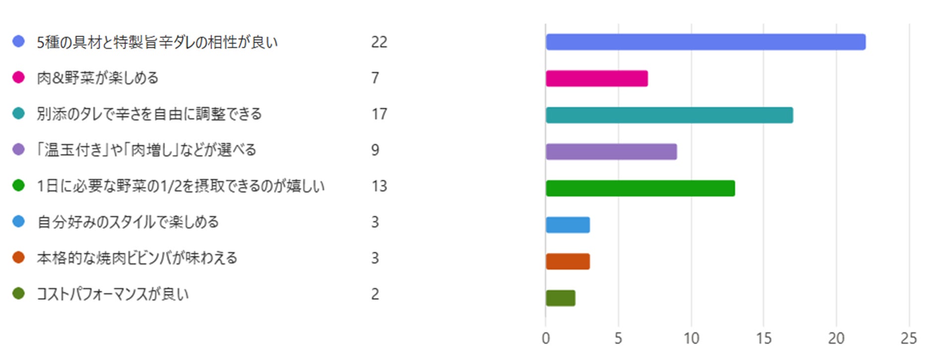 最も多くの票を集めたのは『5種の具材と特製旨辛ダレの相性が良い』というポイントでした。2位は『別添のタレで辛さを自由に調整できる』、3位は『1日に必要な野菜の1/2を摂取できるのが嬉しい』でした。