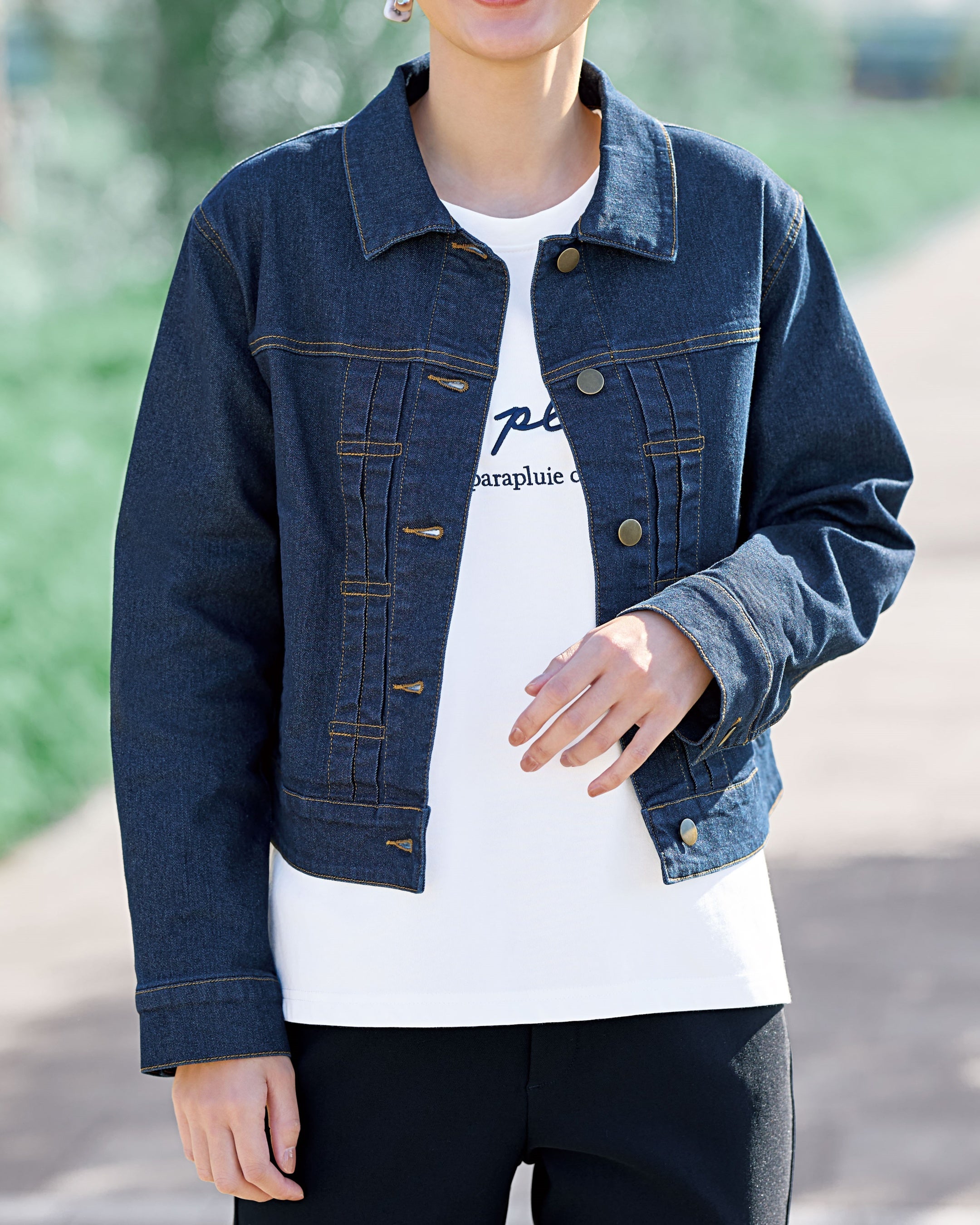 ステンカラーのベーシックなデザインが魅力のデニムジャケット。フロントに施したタックが縦のラインを強調し、すっきりとした印象を演出します。適度にゆとりのある着やすいサイズ感で、程よく短めの丈がコーディネートの重心を上に見せ、スカートやワイドパンツとも好相性です。