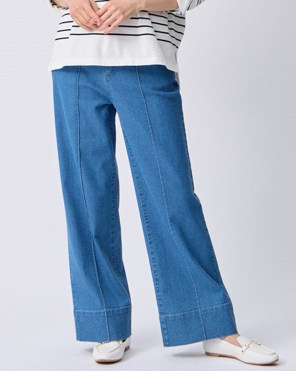 センターに施したピンタックステッチが縦のラインを強調し、脚長見え効果が期待できるワイドシルエットのデニムパンツ。