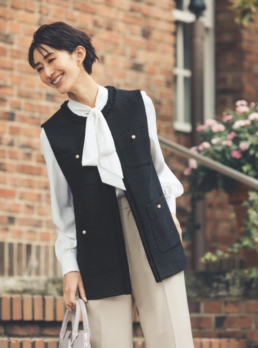 ネイビーのツイードジレと白いボウタイブラウス&パンツの2トーンで上品に鮮度アップ