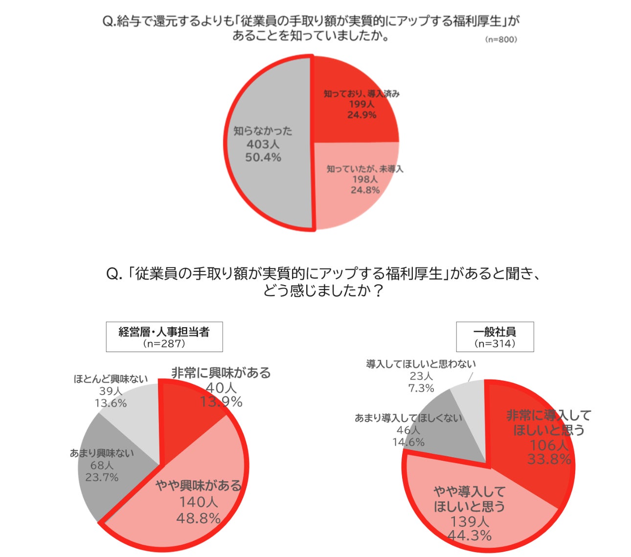 ・一方「従業員の手取り額が実質的にアップする福利厚生」を知らない経営層・人事担当者は6割以上が興味があると回答し、8割近くの一般社員が導入してほしいと感じている。