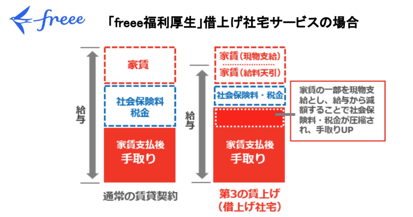 「スモールビジネスを、世界の主役に。」をミッションに掲げる弊社は、このような社会情勢への対策として、中小企業でもコストをかけずに従業員の手取り額を増やす福利厚生である借り上げ社宅制度に着目し、導入・運用をトータルサポートするサービスとしてfreee福利厚生をリリースしました。