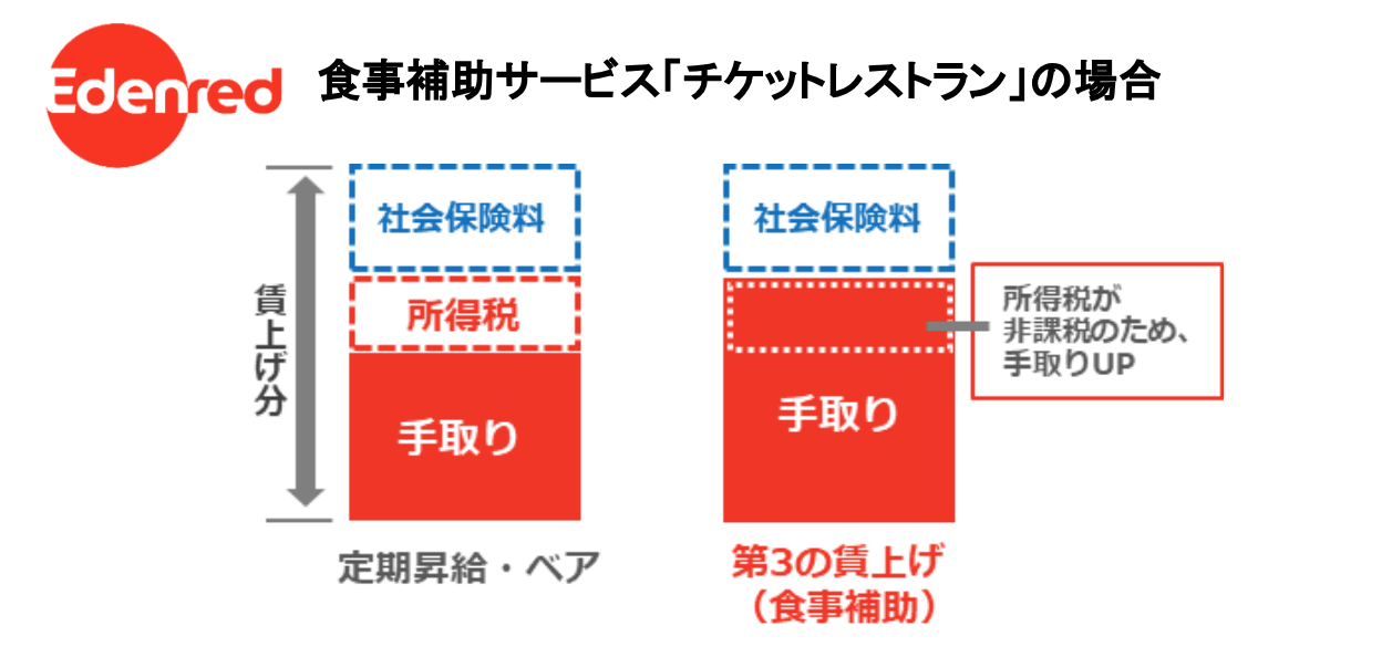 エデンレッドジャパンの食事補助サービス「チケットレストラン」で支給される食事代は、福利厚生費に計上でき非課税となること、また「freee福利厚生」は、給与の一部を社宅家賃として住宅の現物支給に切り替えることで、従業員の手取りアップと企業のコストダウンにつながります。その他、企業型確定拠出年金など、非課税対象となる福利厚生の活用も、同様の賃上げ効果があります。