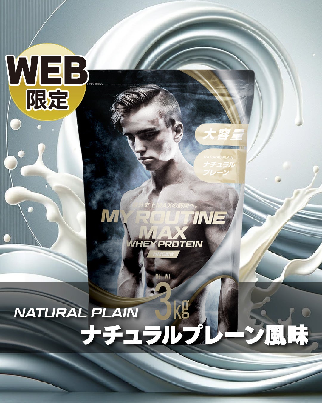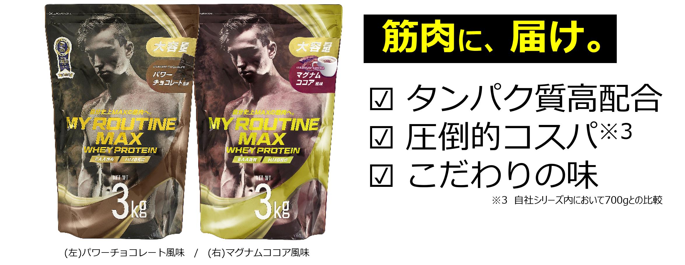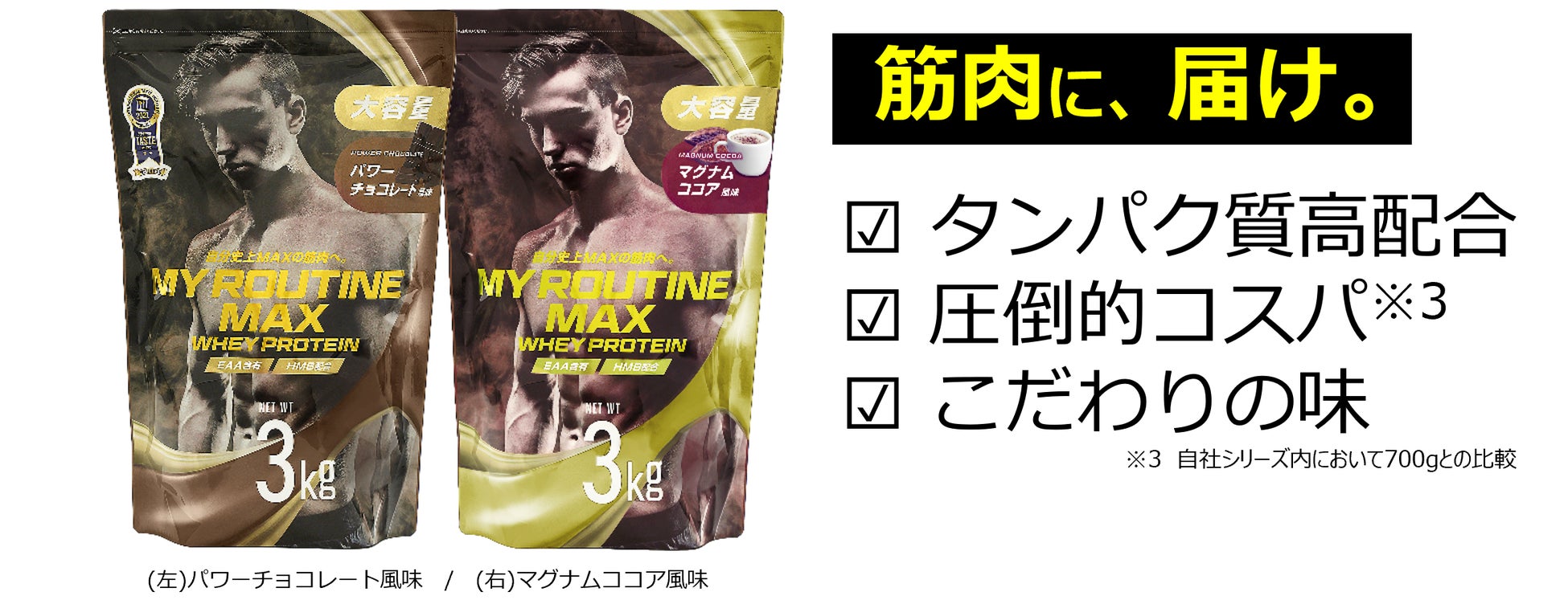 トレーニングする方やダイエッターのカラダ作りのサポートに効果的なホエイプロテイン。マイルーティーンMAX 3kgは、公式自社サイトの販売価格6,480円(税込)で、1食あたり76円※3を実現し、コストパフォーマンスの高い商品となっています。日常的に多くのプロテインを摂取するアスリートやスポーツをおこなっている方には、大容量タイプがおすすめです。