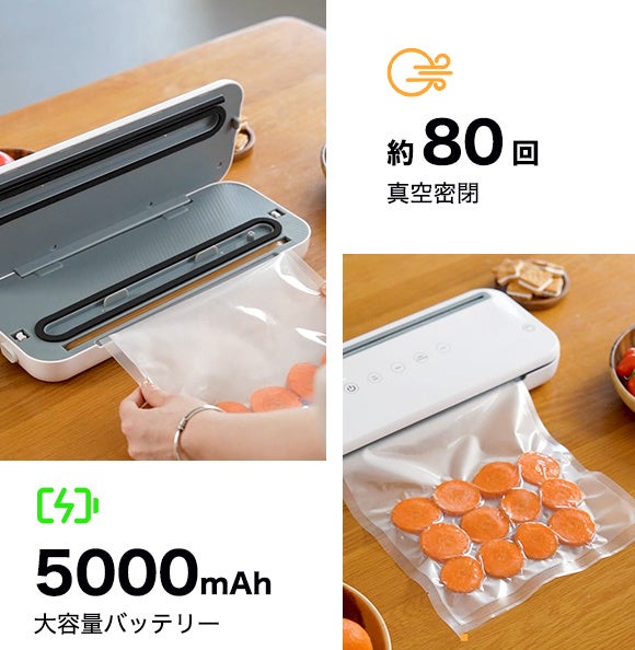 【Mosocoコードレス真空パック機】は吸引力が65kpaもあるので、真空状態を一気に作ることができます。そのため、従来の保存方法と比較して、食材が劣化することなく鮮度が長持ち、貯蔵期間が5-8倍ほど長くなります(貯蔵可能期間は食材により異なります)。