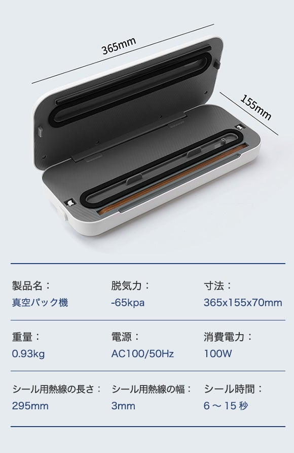- 真空パック、ヒートシール、カッターの3-in-1機能