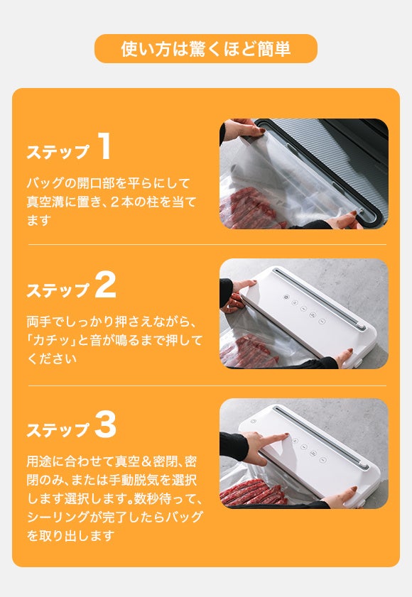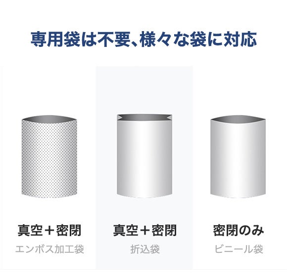 - 自動で脱気&シールが可能。手動で脱気もできて汁物やパン、煎餅などの潰れやすい・割れやすい食材にも対応