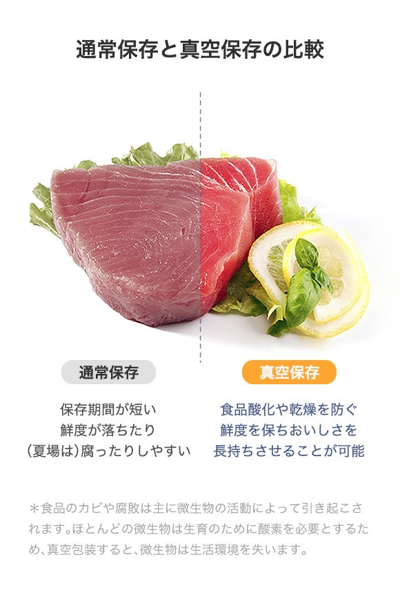 保存期間を延ばすだけではなく、食材の「味」「香り」「食感」も長持ちさせ、いつまでも作りたてのような味を楽しめます。