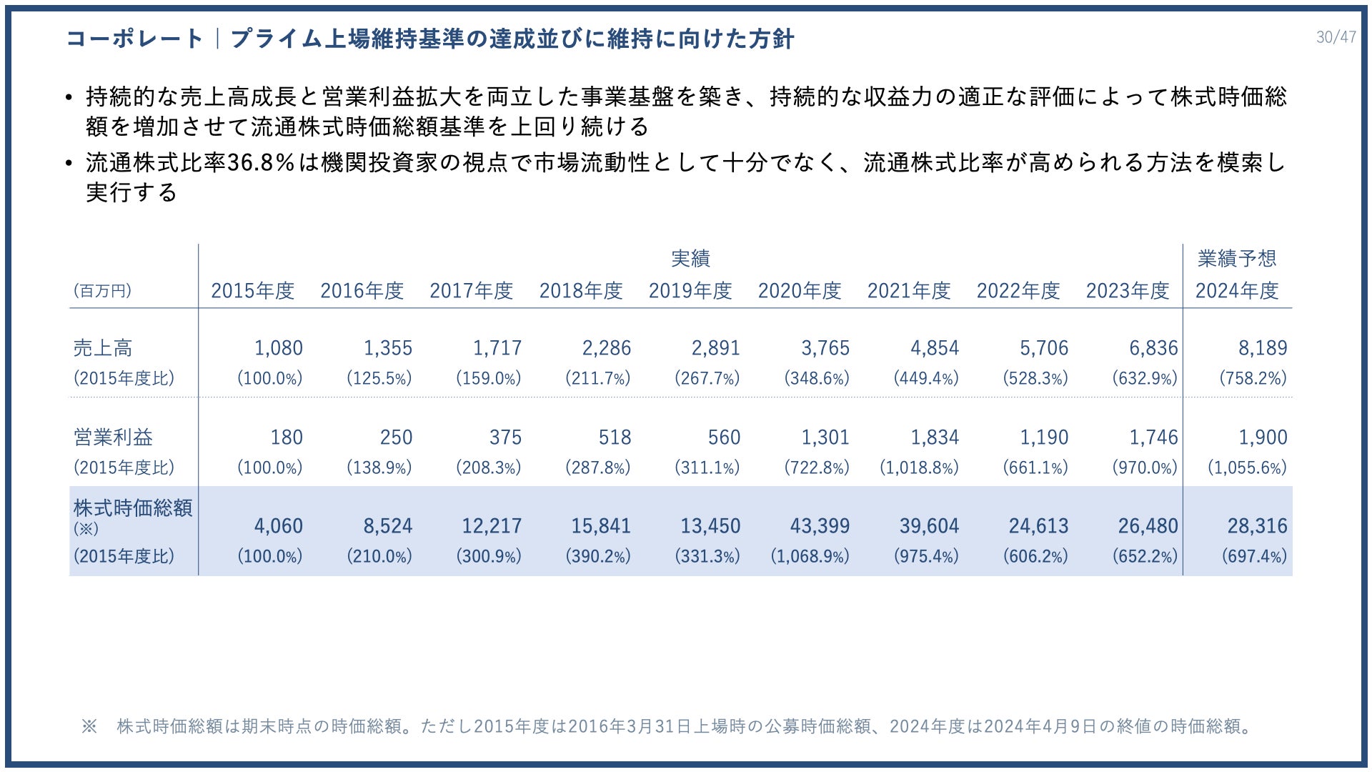 持続的な売上高成長と営業利益拡大を両立した事業基盤を築き、持続的な収益力の適正な評価によって株式時価総額を増加させて流通株式時価総額基準を上回り続ける方針です。