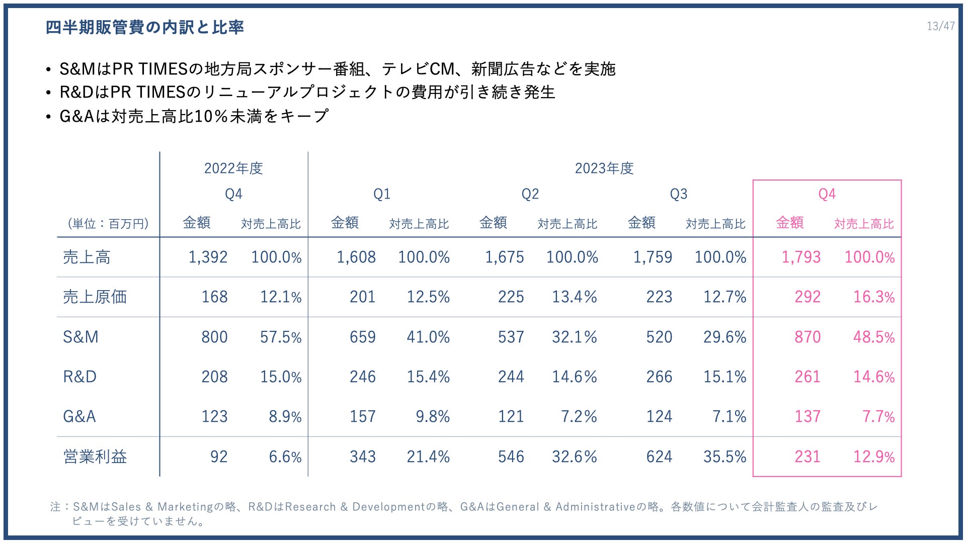 S&Mは、PR TIMESの地方局スポンサー番組、テレビCM放映、新聞広告を実施し、売上高比率48.5%となりました。R&Dは、PR TIMESのリニューアルプロジェクトの費用が引き続き発生し、売上高比率14.6%となっています。G&Aは売上高比率7.7%と10%未満をキープしています。