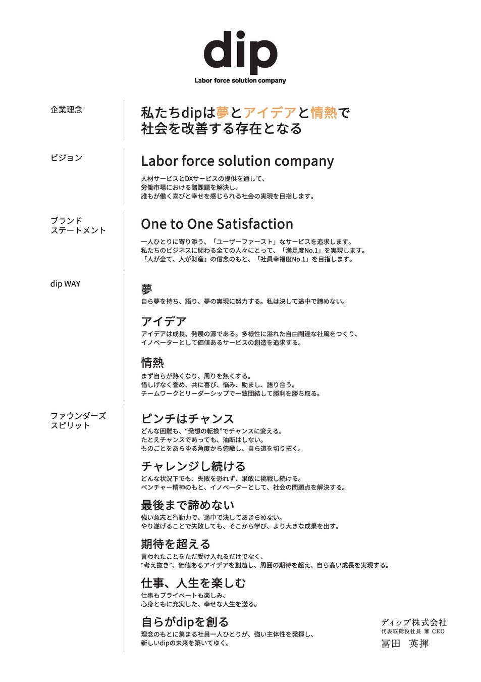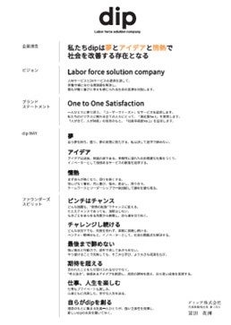 当社は「私たちdipは夢とアイデアと情熱で社会を改善する存在となる」という企業理念のもと、ビジョン「Labor force solution company」を掲げ、人材サービスとDXサービスの提供を通して、労働市場における諸課題を解決し、誰もが働く喜びと幸せを感じられる社会の実現を目指しております。