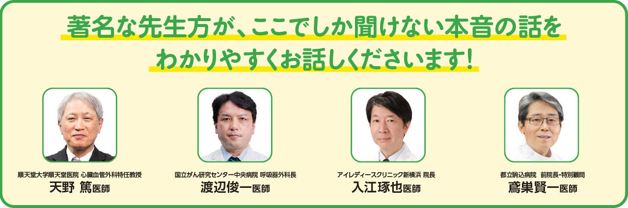心臓のオフポンプ手術の第一人者で上皇陛下の手術執刀でも知られる順天堂大学順天堂医院の天野篤医師と、肺がん手術数20年連続1位・国立がん研究センター中央病院の渡辺俊一医師が、「いい病院」の内側と、医療の進歩、最新治療について対談します。
