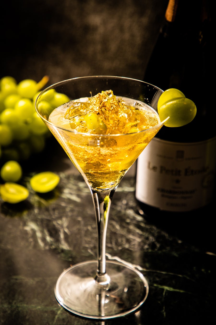 カクテルは、白ぶどうのジュレにノンアルコールスパークリングワインを注ぎ、大粒のシャインマスカットと金粉をあしらいデコレーション。仄かな甘みと上品な酸味が愉しめるノンアルコールカクテルに仕上げました。