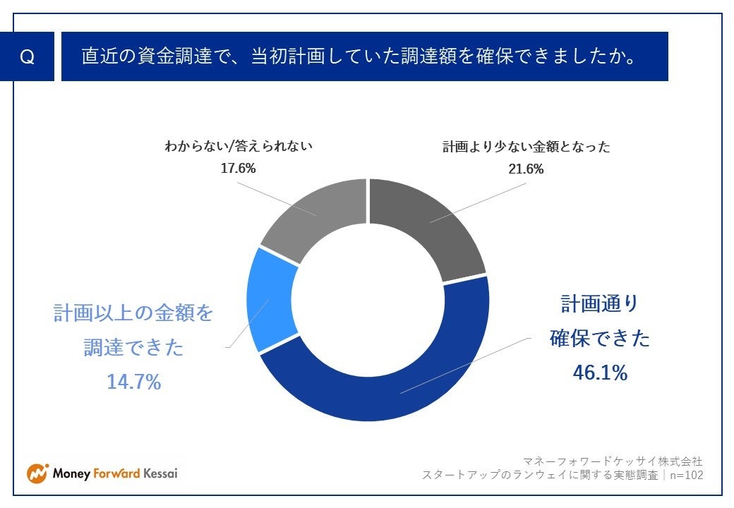 「Q.直近の資金調達で、当初計画していた調達額を確保できましたか。」(n=102)と質問したところ、「計画通り確保できた」が46.1%、「計画以上の金額を調達できた」が14.7%と、合わせて6割以上の企業が「計画通り」または「計画以上」の調達額を確保できたと回答しています。