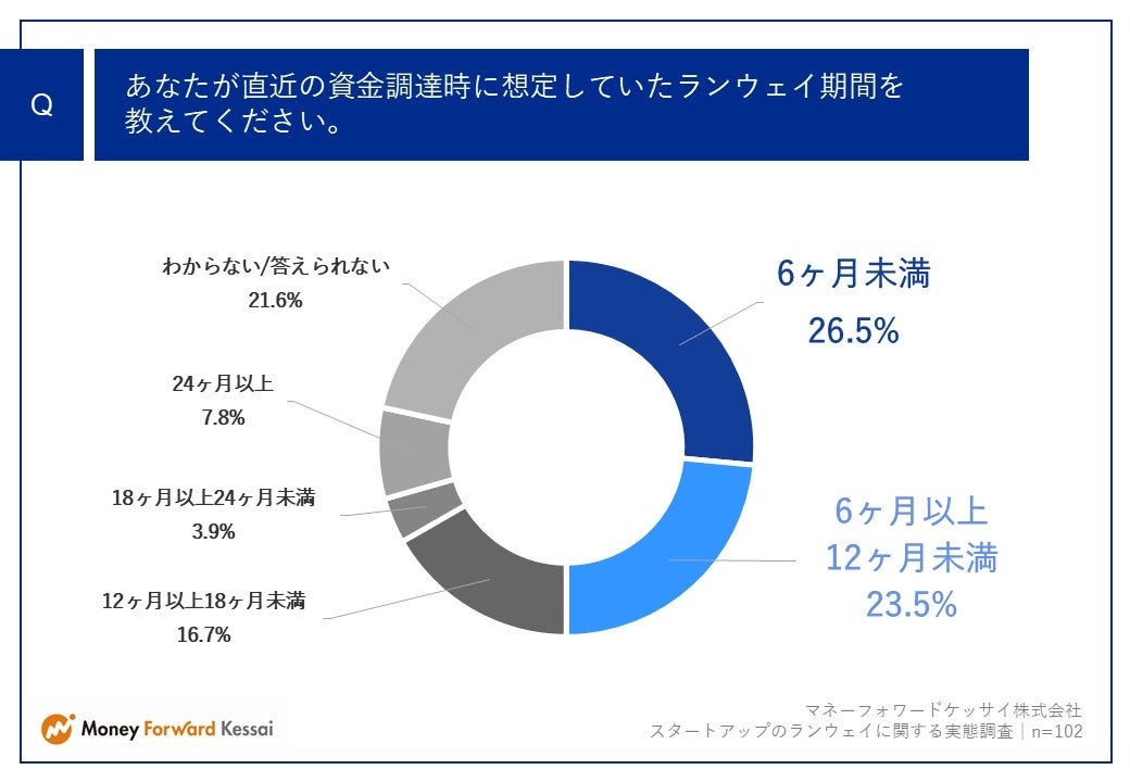 「Q.あなたが直近の資金調達時に想定していたランウェイ期間を教えてください。」(n=102)と質問したところ、「6ヶ月未満」が26.5%、「6ヶ月以上12ヶ月未満」が23.5%という回答となり全体の半数が1年未満の短期的なランウェイを想定しており、迅速な成長や次の資金調達を視野に入れていることが明らかになりました。