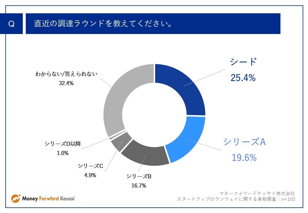 「Q.直近の調達ラウンドを教えてください。」(n=102)と質問したところ、「シード」が25.4%、「シリーズA」が19.6%という回答となりました。
