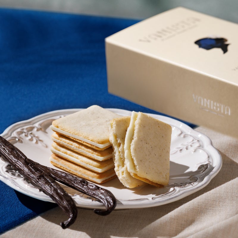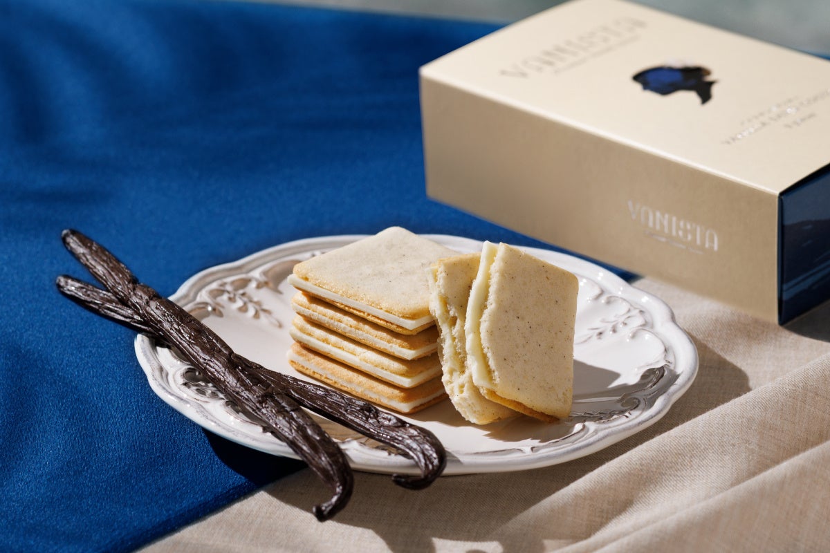 タヒチ産バニラの華やかな香りと、宮古島の雪塩のまろやかな旨みを練り込みサクサクに焼き上げたクッキーで、芳醇なバニラチョコをサンドしたクッキー。ひと口かじれば軽やかにほどけ、口の中いっぱいに広がるバニラの香りは余韻まで楽しめるVANISTAの看板商品です。