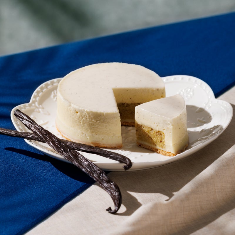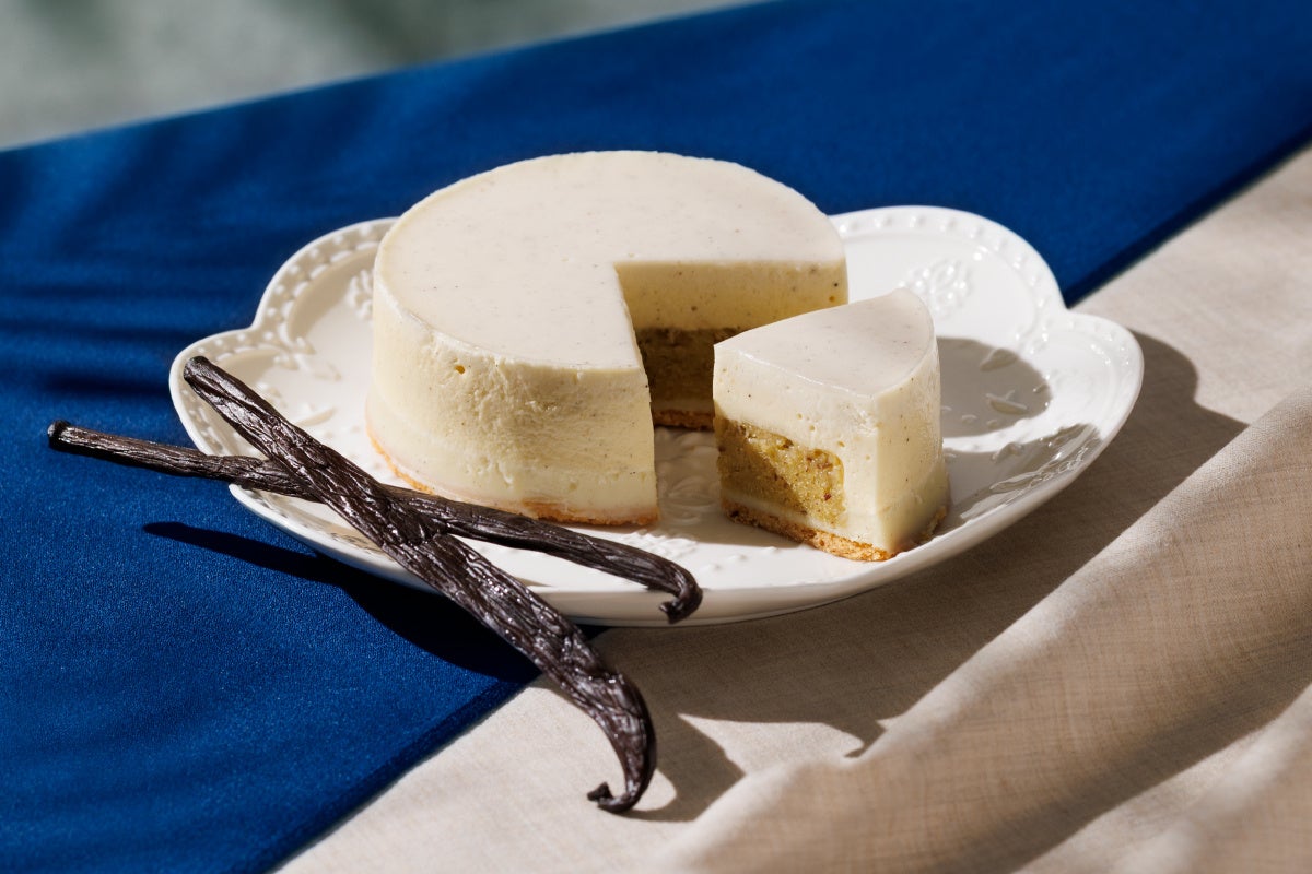 タヒチ産バニラとグラスフェッドバターで焼き上げたバニラダマンド生地に、芳醇でなめらかなバニラガナッシュと華やかなバニラムースを重ねたVANISTA特製のケーキ。
