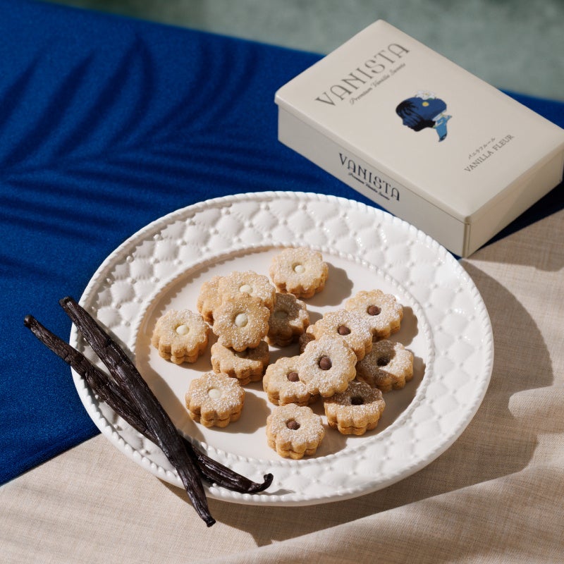 小さな花のかたちに模ったタヒチ産バニラを練り込んだ可憐なサブレに、バニラホワイトチョコとバニラミルクチョコをひとつひとつ丁寧に絞り、サンドしました。仕上げに粉糖を纏わせ、華やかで愛らしい印象に。蓋を開けた瞬間に広がるバニラの芳醇な香り、サクッと軽やかなサブレとなめらかなチョコのコントラスト。バニラの奥深い魅力を存分にお楽しみください。