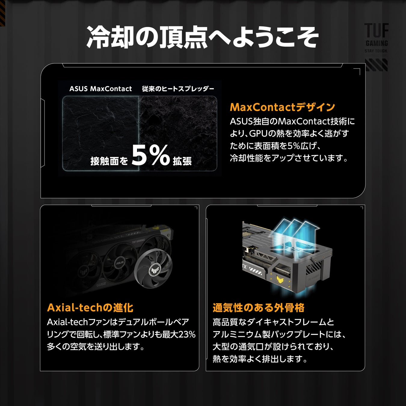 ASUS独自の製造プロセスで、GPUのヒートスプレッダの表面積を5%拡大。強力なヒートシンクとAxial-techファンと組み合わせることで、最大2°Cの温度改善を実現。