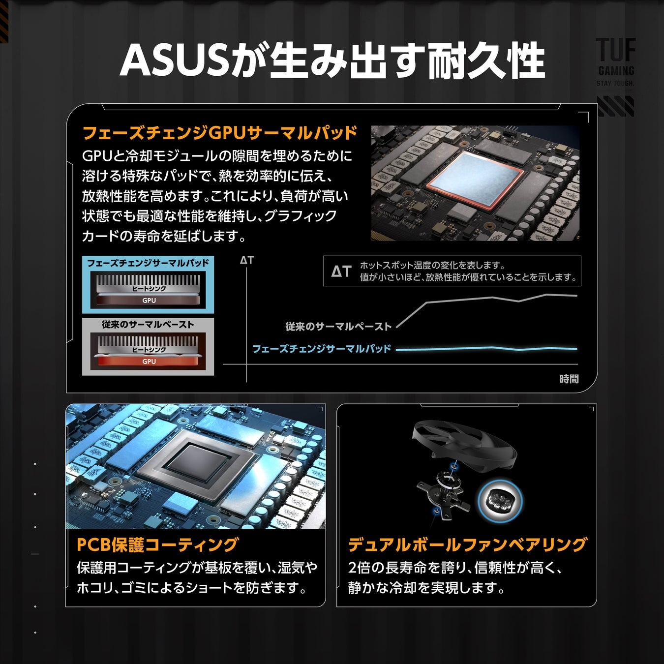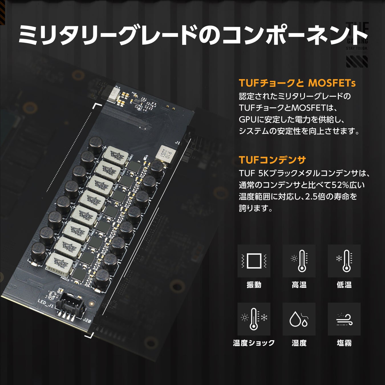 認定されたミリタリーグレードのTUFチョークとMOSFETは、GPUに安定した電力を供給し、システムの安定性を向上させます。