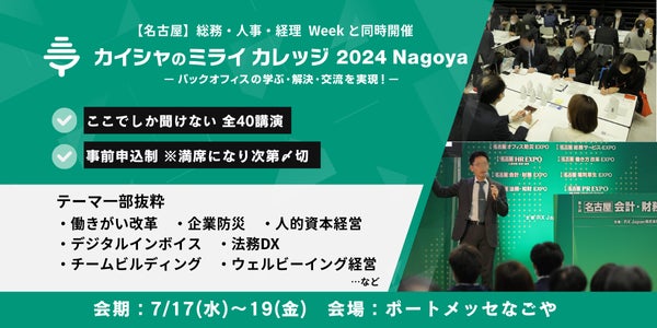 セミナー・交流イベント『カイシャのミライ カレッジ』は、【名古屋】総務・人事・経理 Weekと同時開催いたします。会期:7/17(水)~19(金) 会場:ポートメッセなごや