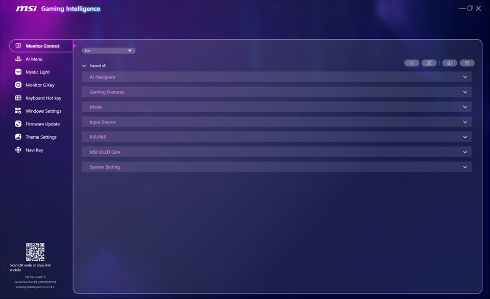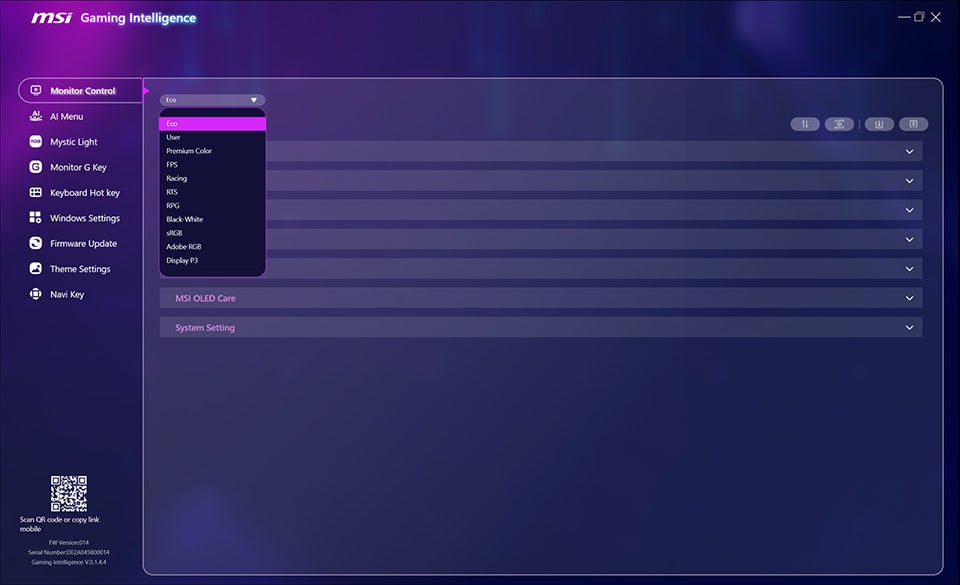 「Monitor Control」では、Eco、ユーザー、FPS、レーシングなど、現在の活動に合わせてさまざまなプリセットモードをすばやく切り替えることができます。