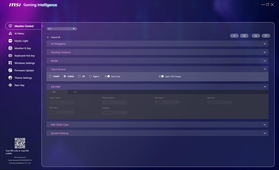 MSI Gaming Intelligence (G.I.) は、キーボードとマウス操作で直接画面機能を設定できるようにすることで、ユーザー体験を向上させるために設計された強力なソフトウェアです。モニターの物理ボタンを操作する必要性をなくすことで、G.I. は常にオンスクリーンメニューを操作することなく、パフォーマンスを最適化するためのより直感的な方法を提供します。USBケーブルとHDMIまたはDPケーブルでモニターを接続するだけで、ピクチャーモード設定の「Monitor Control」、アプリケーションごとの「AI Menu」、RGBライティングをカスタマイズする「Mystic Light」、お好みの「ホットキー設定」など、モニターのコントロールとパフォーマンスの最適化を簡単に行うことができます。
